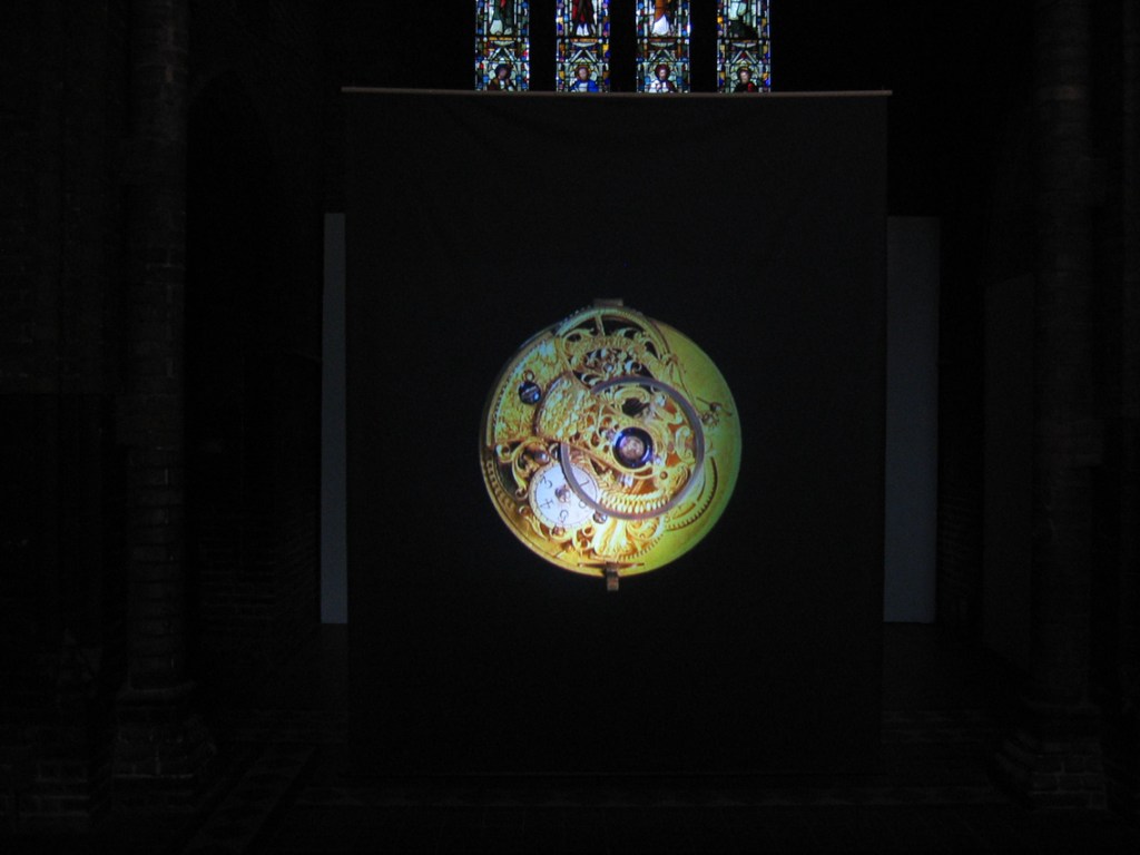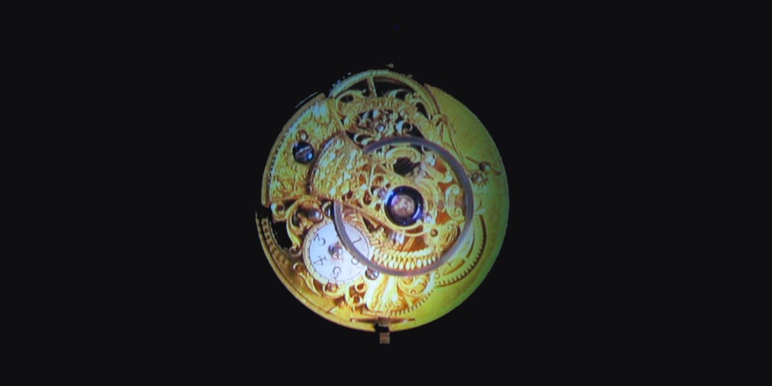 Live projection of the inner workings and outer face of an antique pocket watch were installed opposite to each other. The accompanying audio of the amplified ticking of the pocket watch was accessed through headphones. The watch time was set to Switzerland where the watch was made.
