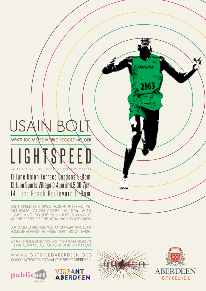 The work consisted of a 100 metre installation with light and sound that traversed it at the speed of the 100m world record. Participants were invited to race the light, to pit themselves against the speed of the world record holder, Usain Bolt.