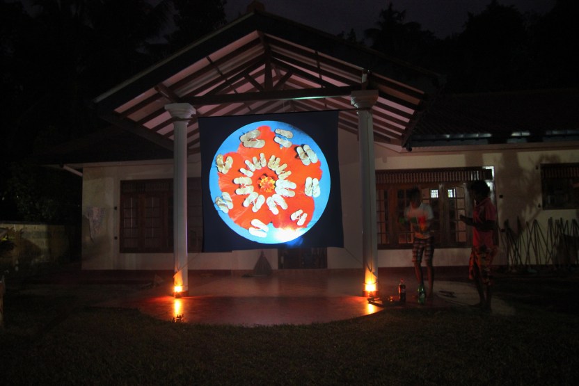 We made a ‘Busby Berkley ‘style stop frame animation with the paper ‘slippers’ using photos of the flower that grow in the village as the backdrop, reflecting our feelings of surrealness during our time in Sri Lanka. We put up a screen between the pillars of our house, which was viewable from the road and borrowed a projector from the local community project. We projected the animation at dusk together with an animation that Hannah had made of local house brooms. We also made an installation with the paper ‘slippers’ and the dog poster was on display.