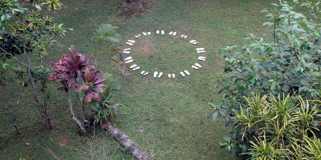 We made about twenty five pairs in all sizes and experimented with the shoes in different places. We installed them (temporarily) in different formations at natural gathering places along the local tracks in the jungle as ephemeral installations marking public space as well as outside houses and in gardens. This process helped us to explore the public space in the village which seemed to be mainly temples and space outside the small shops. This caused much interest as well as discussion and identification of the plants that the flip-flops were made out of.