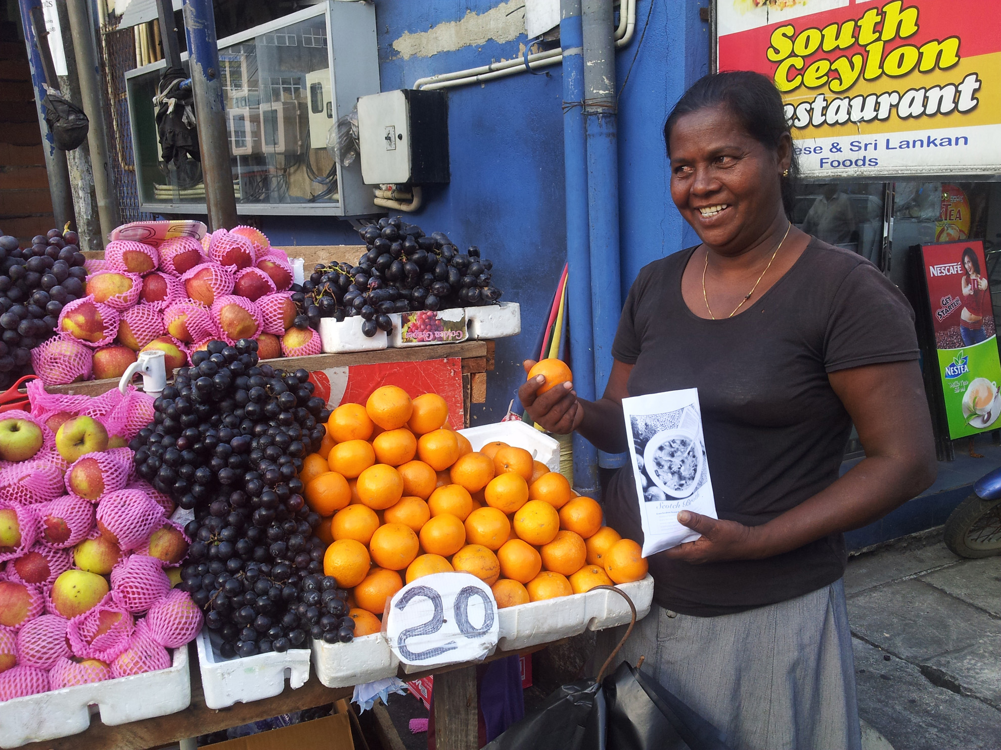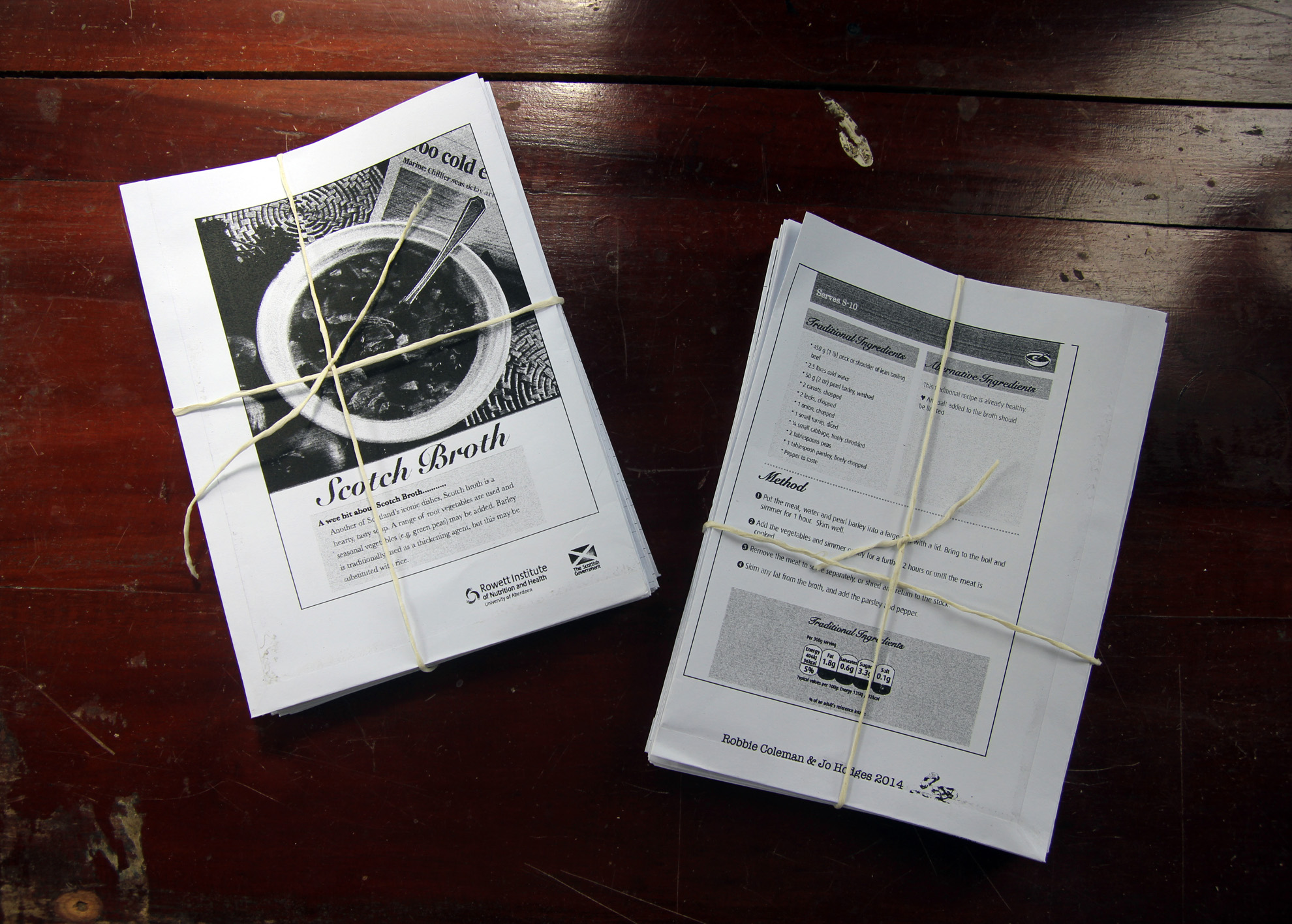 Within the bag project we developed a small-scale collaboration with Garry Duthie, Prof. of Nutritional Science at the Rowett Institute of Nutrition and Health, Aberdeen who had developed a recipe book called ‘Stovies Reloaded’, reworking traditional Scottish recipes to make them healthier. We had been surprised to see so many vegetables commonly grown in Scotland on sale in the markets in Sri Lanka; leeks, potatoes, cabbage , beetroot etc. (a British colonial legacy?) We used recipes from ‘Stovies Reloaded’, had them printed and made them into bags for street sellers. We wondered if some Sri Lankan homes would end up experimenting with Scotch Broth and leek and potato soup! We sent images to Garry Duthie which made for interesting discussion points about recycling and healthy snacks as well as the history of global food systems back in Scotland.