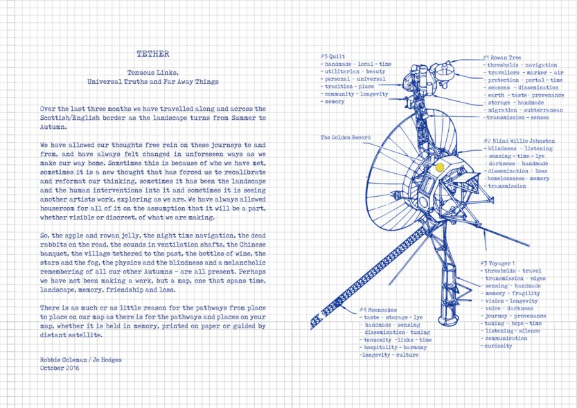 “During our journey through this residency, new links that have been made, new grooves been cut and new journeys undertaken, but we have found ourselves, time and again, taking a step back and noticing the web that we are in. We have been trying to tune in to moment and place through time. Just like the voyager signal caught in the deep space antennae, like the radio catching a blues song, like the rowan jelly carrying the echoes of the underground – we are trying to sense what might be there in the spaces in between, reminding ourselves to receive not just broadcast.