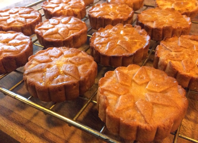 “We celebrate our return by a tasting of homemade Cantonese Mooncakes. Moon cakes are a traditional part of the Chinese celebration of the mid-autumn full moon when they are offered between friends and family. We used the following ingredients to make our mooncakes: For the dough Plain flour, Lye, golden syrup, vegetable oil, vanilla extract. Balls of lotus nut paste were then wrapped in the dough and pressed into Mooncake moulds which shape them and make imprints on the top. They are then baked.