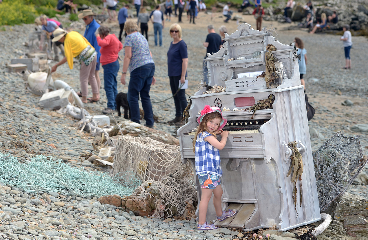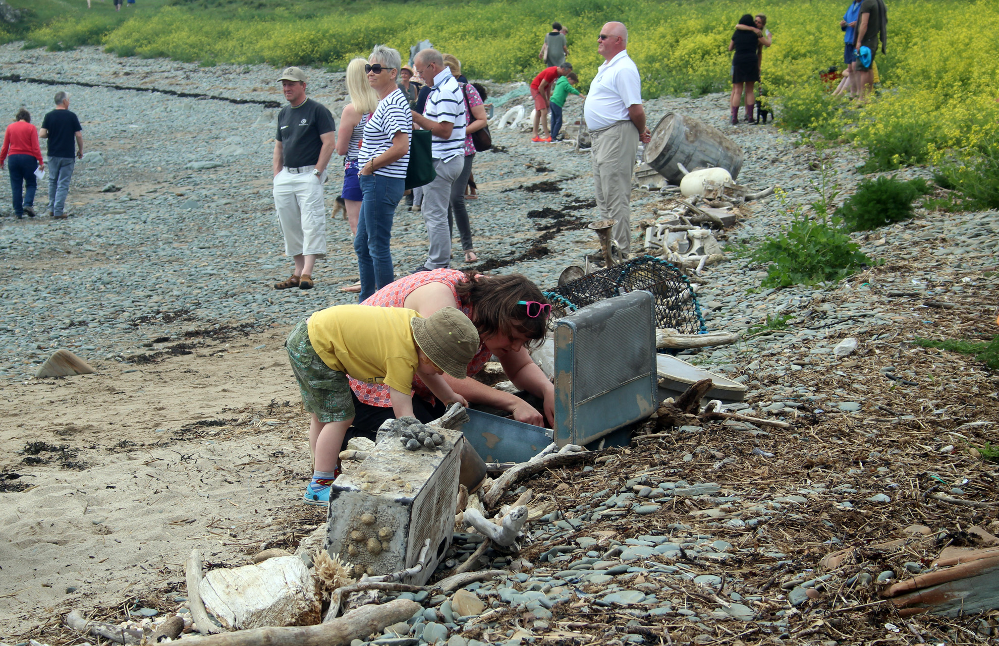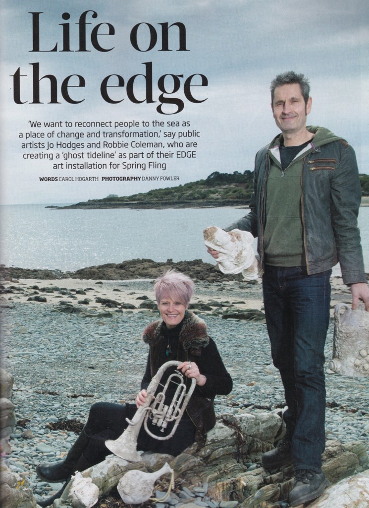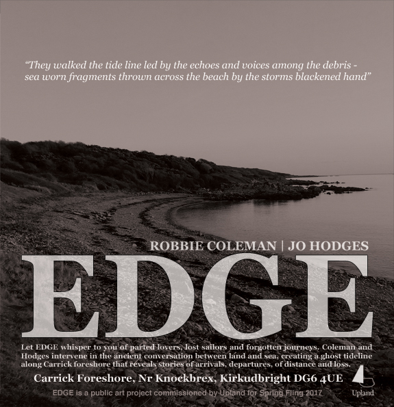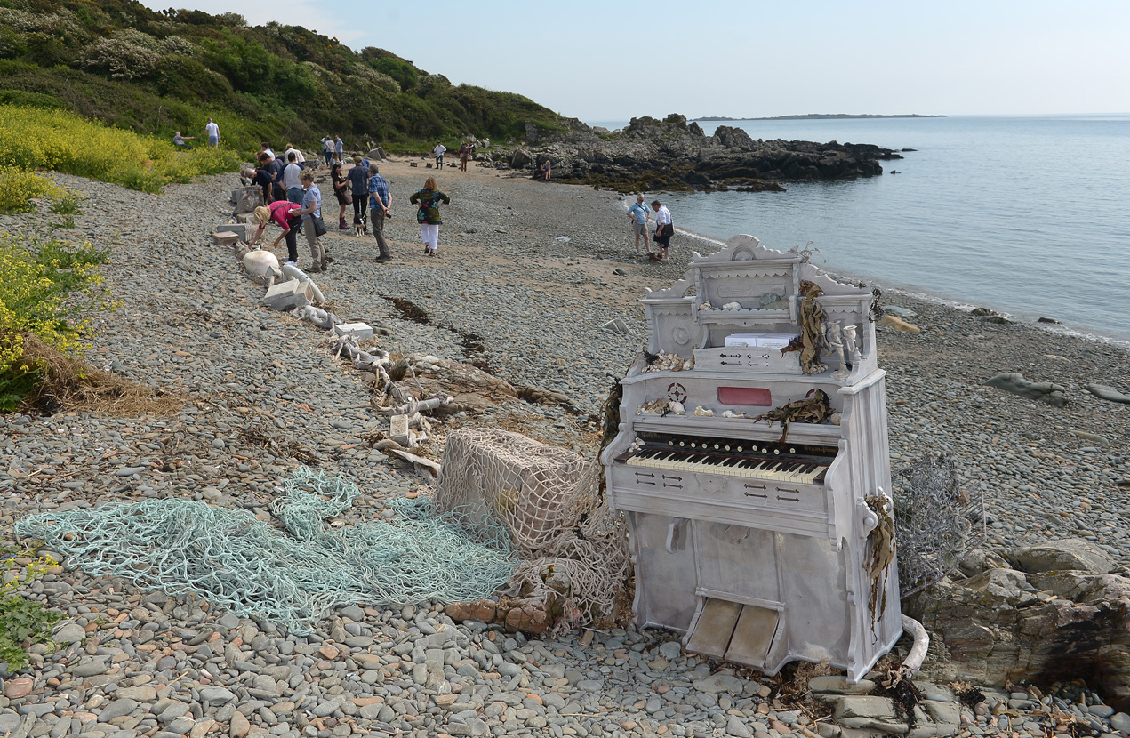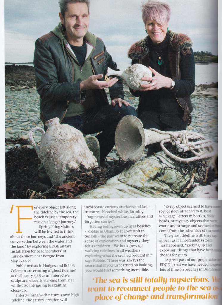 EDGE was a ghost tide line that followed and entwined with the existing one at Carrick Foreshore, formed using detritus collected along the coast together with curious objects and artefacts large and small, given to, created or found by the artists. These clusters of objects formed fragments of mysterious narratives and forgotten stories, some real, some imagined, some playful, others full of sadness and loss. The stories explored the nature of the link between this land and distant places and became part of the ancient tidal conversion between the sea and the shore.