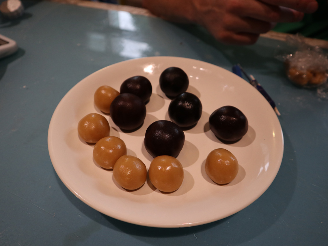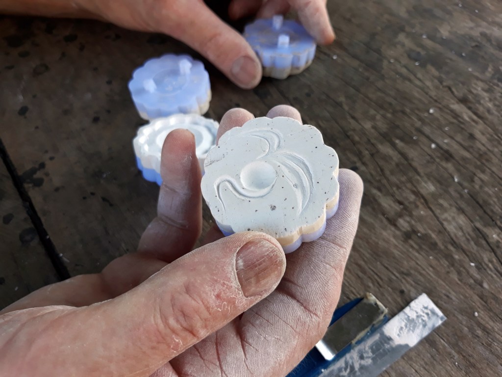 We arrived in Taiwan just before the important Mid-Autumn Festival (中秋節). A key part of the contemporary holiday celebrations are outdoor barbecues and karaoke as well as offering traditional Moon Cakes between friends and family. The traditional Moon Cakes are filled with red bean or date paste and some have a salted egg in the centre to represent the moon. Moon Cakes have an imprint on the top consisting of the Chinese characters for “longevity” or “harmony”. We discovered that very few people make Moon Cakes these days, instead they are bought from bakeries. We decided to learn to hand make them and also made new moulds for the pattern on the top relating to the moon’s impact on seed growth.