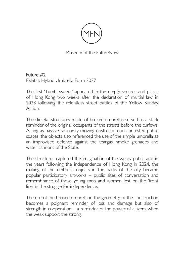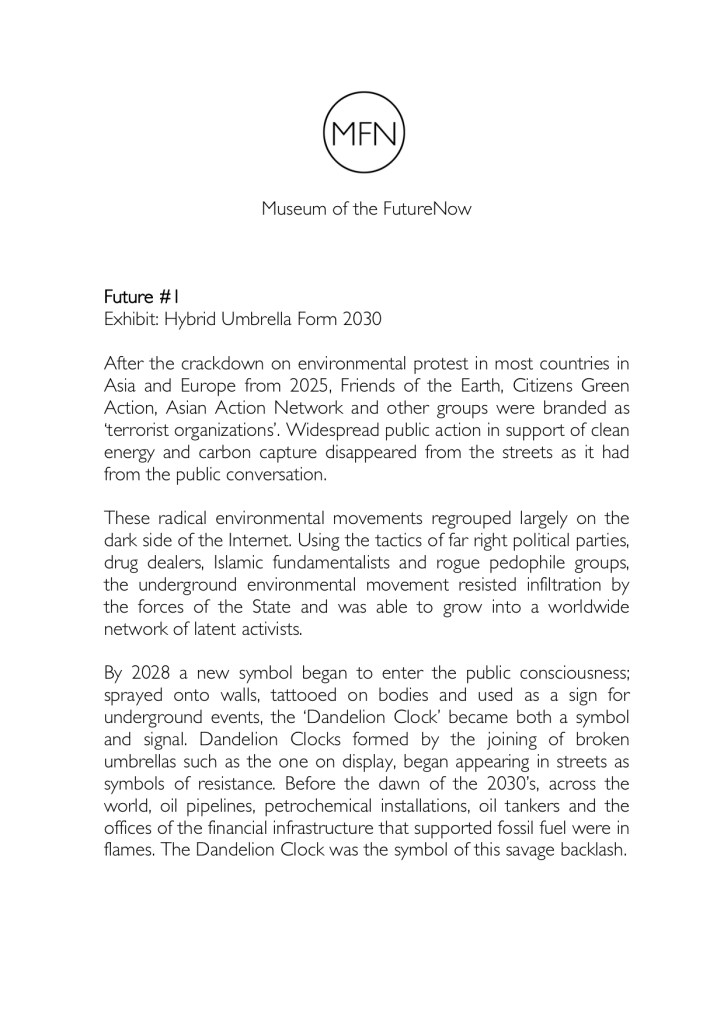 For the BCS Open Studios Event on 25th/26th October we developed a series of future histories for our object and presented the ‘Hybrid Umbrella Form’ as an exhibit from the ‘Museum of the FutureNow’ . These futures formed a type of commentary on our thinking and conversations about politics, the environment and the future. The scenarios use current issues such as predictions for the impact of climate change in Taiwan (more and stronger typhoons, more flooding) and the use of umbrellas in protest movements in Hong Kong as a basis.