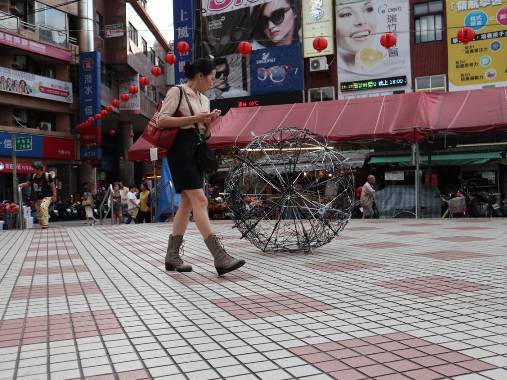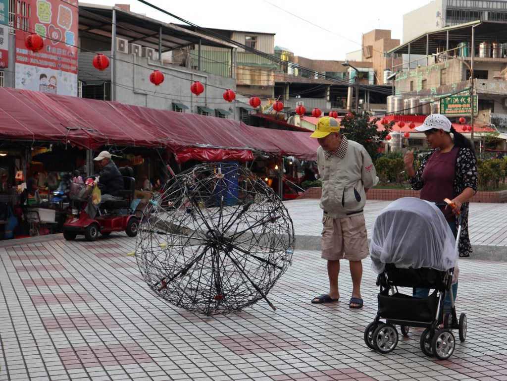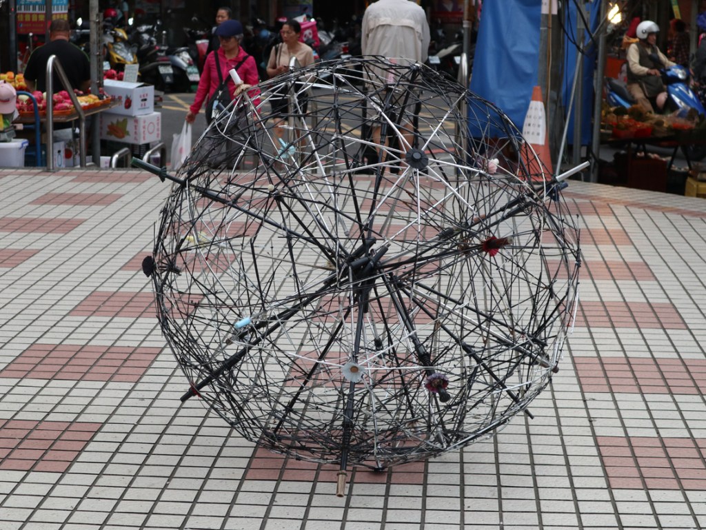 After a typhoon, broken umbrellas litter the streets. These seem to have an emotional, defeated quality that, for us, began to entwine with news footage of the demonstrations in Hong Kong, where umbrellas were/are being used as personal defense against the teargas, smoke bombs and water cannons of the state. On our rooftop studio space we started experimenting with the broken umbrellas and soon realized that however damaged they were as individual objects, in cooperation with other broken umbrellas, they could form strong and resilient new forms and we joined the core geometries, joints and materials to make a spherical ‘Hybrid Umbrella Form’ which we took into Zhuwei.
