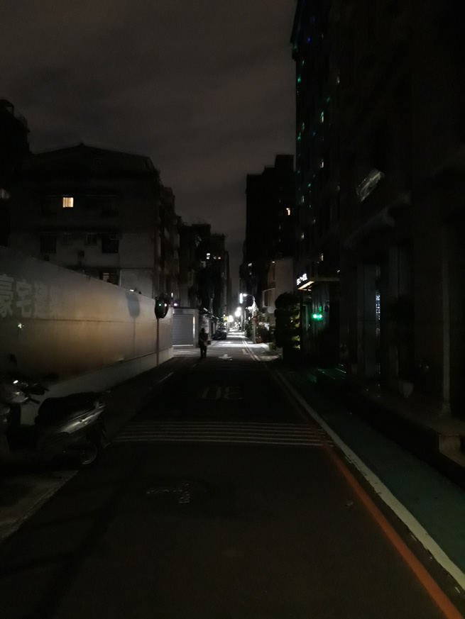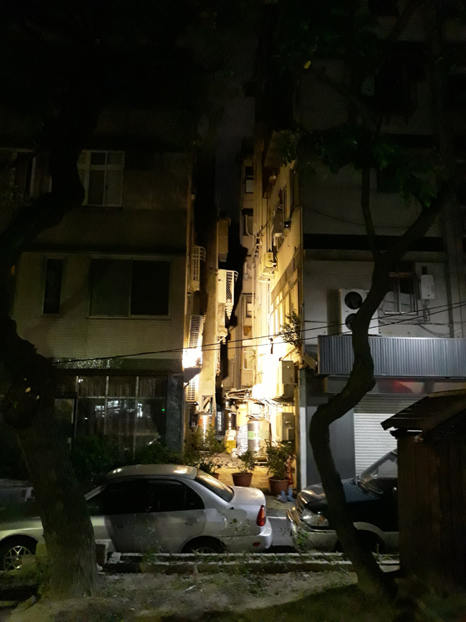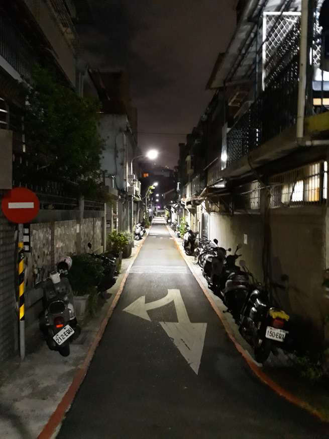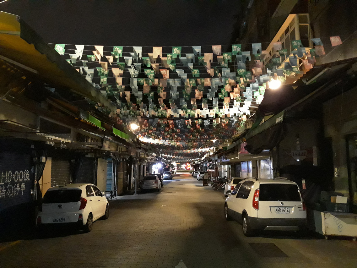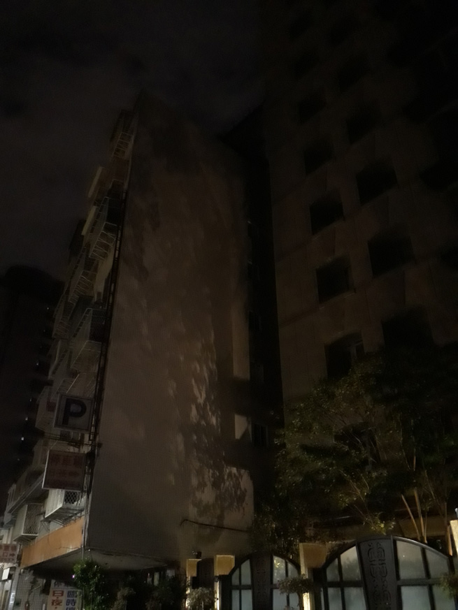 Taipei is an unusual city in terms of lighting, apart from the very central part, which resembles any other modern city – overlit and overbearing, most of the city is underlit. I have become used to tall office blocks and blocks of flats being lit up at night in some way, either by leaving all the internal lights on at night in the case of office blocks or floodlit as part of an architectural plan or light spillage from another source, but Taipei feels quite dark. Street level is illuminated by all manners of different lighting – neon – riotous LED signage and street lighting, but this lighting does not reach up very high and so when you look above this vibrant layer, the buildings above it are dark. This gives a sense that you are walking along canyons or amongst steep hills at night. Sometimes the buildings are felt rather than seen, like walking beneath cliffs at night. The buildings exist as volume/bulk rather than as surface.This made the journey into something unexpected and very beautiful. Although there was plenty of activity at periods during the night, the overall sense is one of calm. Taipei is a pretty flat city so there is not sense of altitudes or the difficulty of the climb that marks out any walking route in northern Britain
