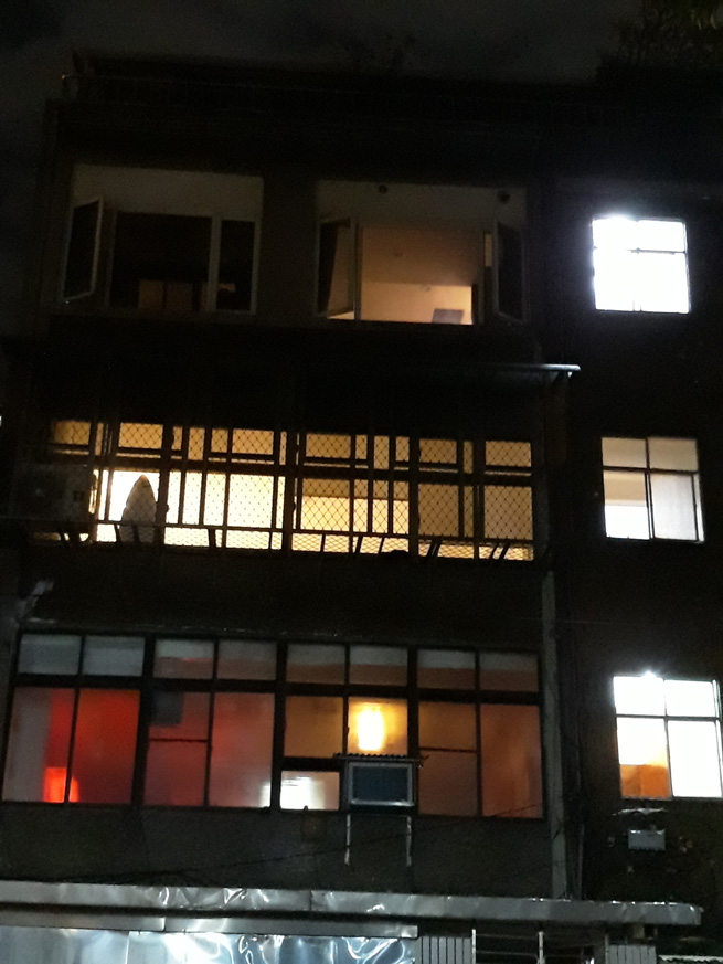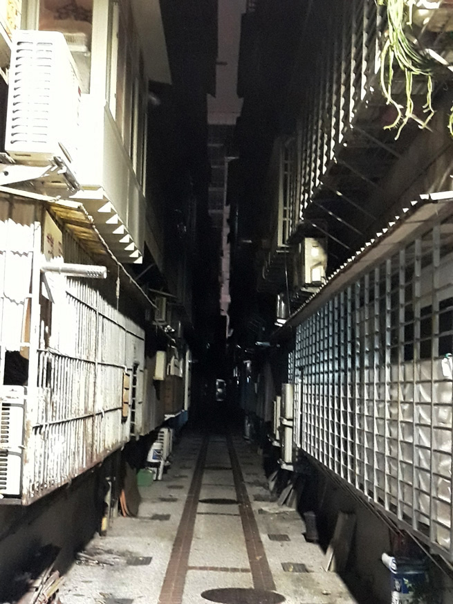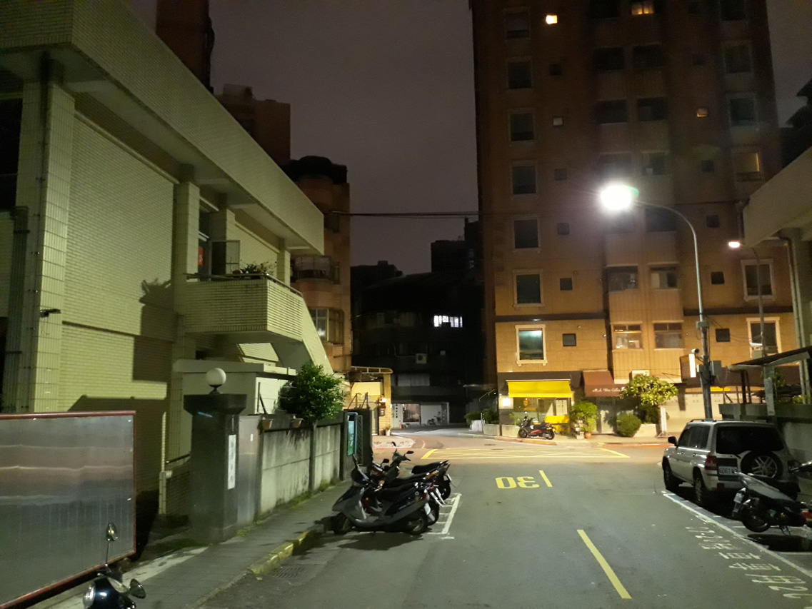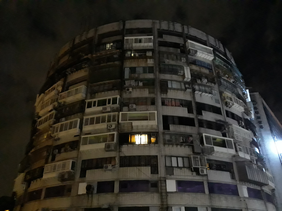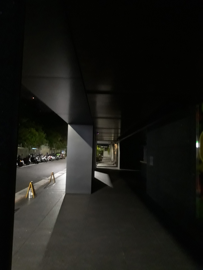 Taipei is an unusual city in terms of lighting, apart from the very central part, which resembles any other modern city – overlit and overbearing, most of the city is underlit. I have become used to tall office blocks and blocks of flats being lit up at night in some way, either by leaving all the internal lights on at night in the case of office blocks or floodlit as part of an architectural plan or light spillage from another source, but Taipei feels quite dark. Street level is illuminated by all manners of different lighting – neon – riotous LED signage and street lighting, but this lighting does not reach up very high and so when you look above this vibrant layer, the buildings above it are dark. This gives a sense that you are walking along canyons or amongst steep hills at night. Sometimes the buildings are felt rather than seen, like walking beneath cliffs at night. The buildings exist as volume/bulk rather than as surface.This made the journey into something unexpected and very beautiful. Although there was plenty of activity at periods during the night, the overall sense is one of calm. Taipei is a pretty flat city so there is not sense of altitudes or the difficulty of the climb that marks out any walking route in northern Britain