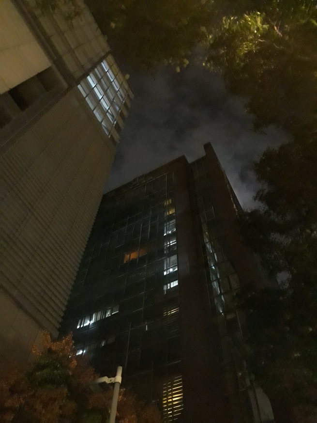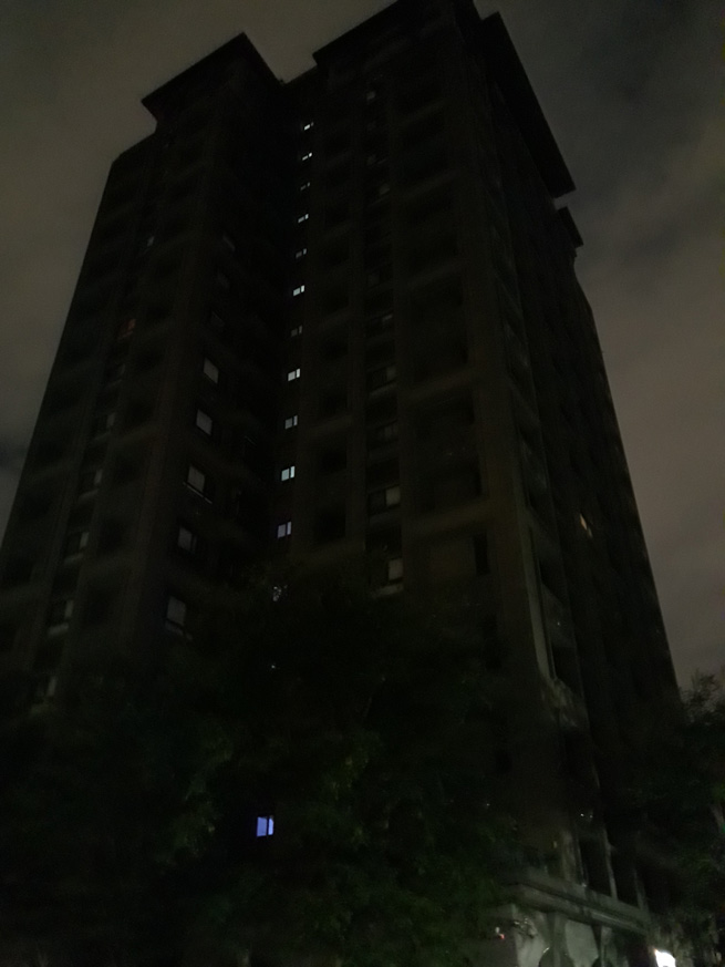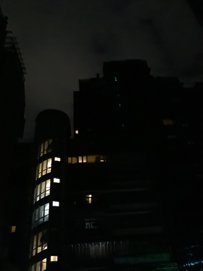 I particularly enjoyed watching the huge high-density housing blocks come to life in the early morning – isolated lit windows appearing in the sheer black walls of the blocks. The architecture changing from something bleak and monolithic to something built of tiny domestic details. Because of the lack of ambient light it was possible to look deep into these living spaces, the vast blocks revealing layers of intimacy.