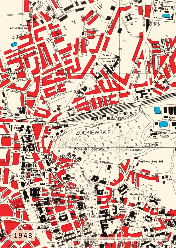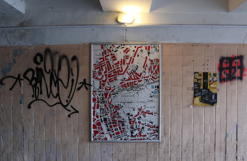 We used archival maps from the past century to reorientate the city with the underpass at the centre. We wanted to draw attention to the underpass as the centre-point of the journey from Lviv city centre to the Jam Factory. The maps also highlighted the changes of sovereignty in Lviv during the past century. Location of underpass circled in red.