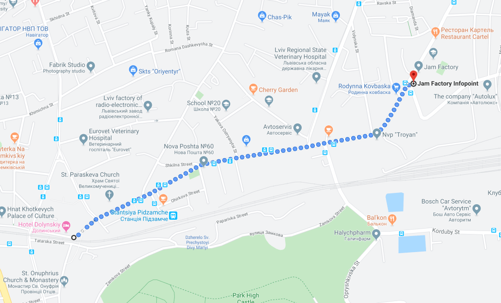 Research and conversations with Jam Factory staff and members of the public highlighted the fact that the Jam Factory is physically, culturally and psychologically distant from the cultural centre of Lviv. We devised a series of strategies to creatively connect the centre of the city to Pidzamche, the post-industrial area where the Jam Factory is situated.
