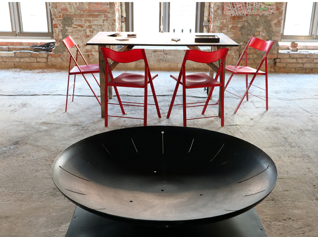The Pidzamche Public Hearth is a fire bowl that can be used to create a public space. It is an offering sent through time to the opening of the Jam Factory.