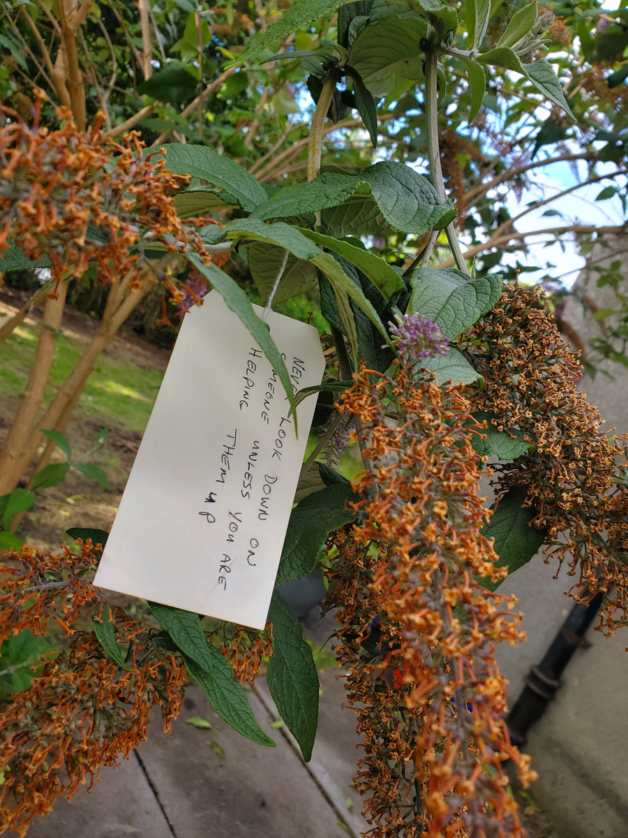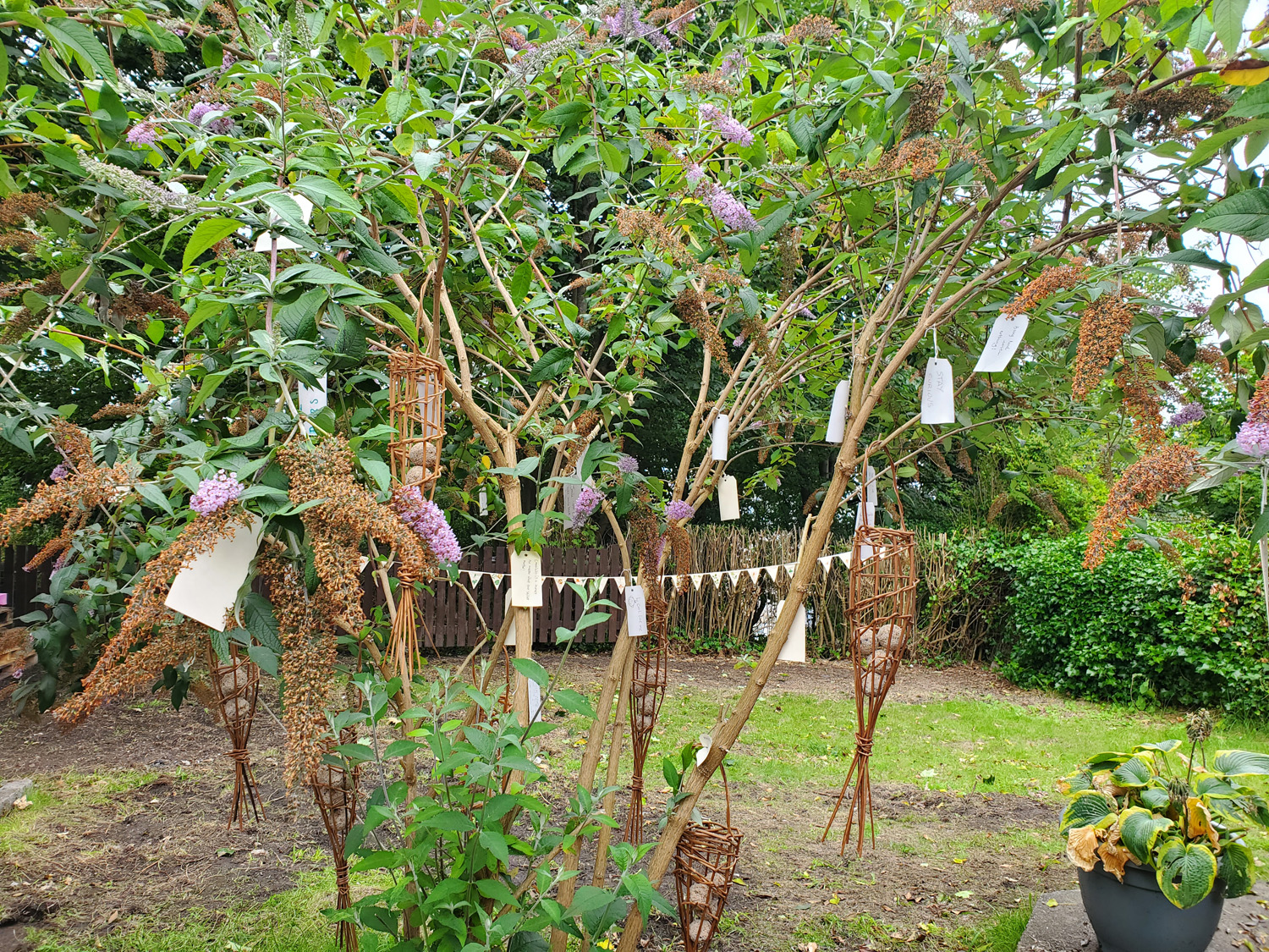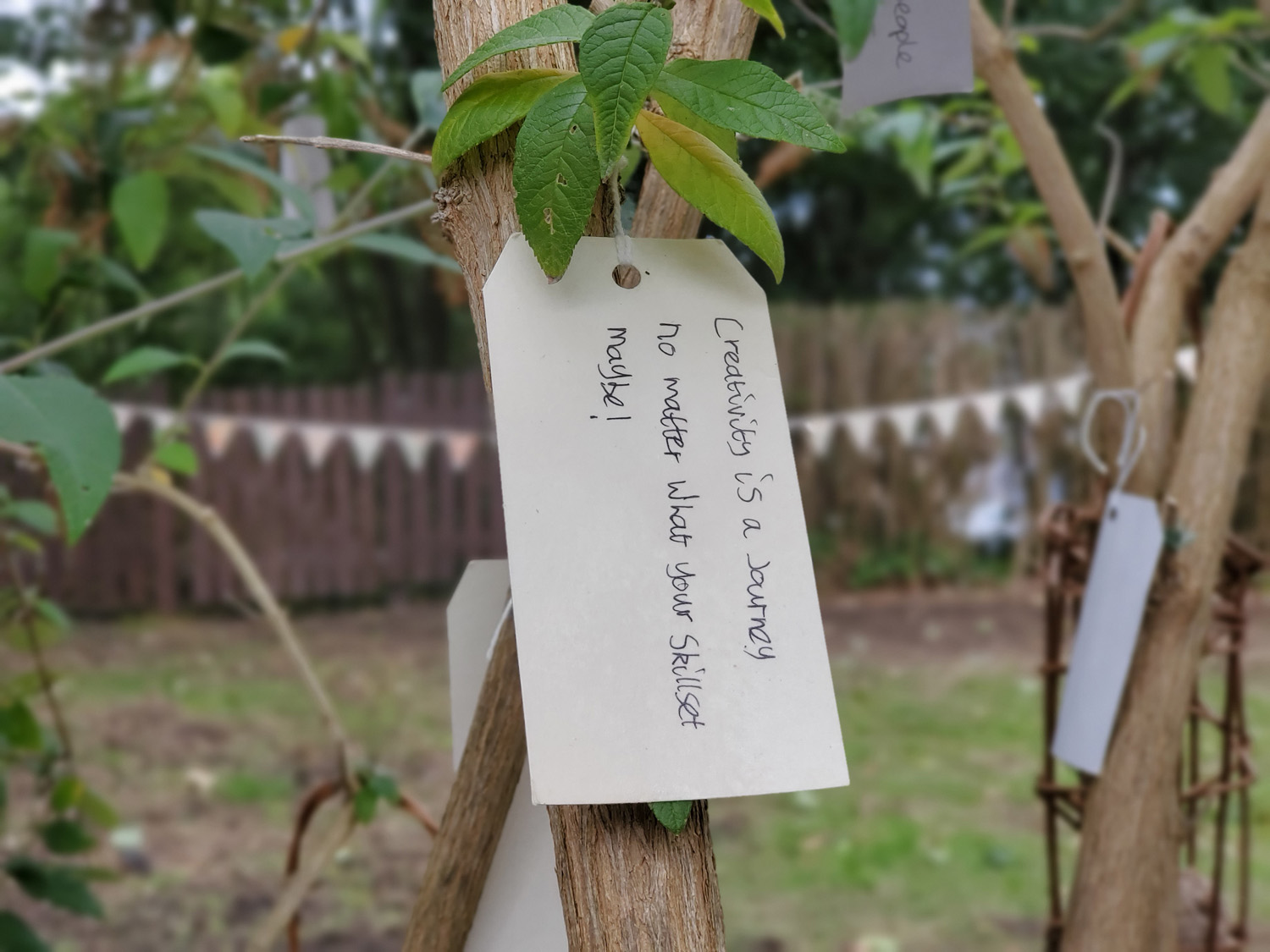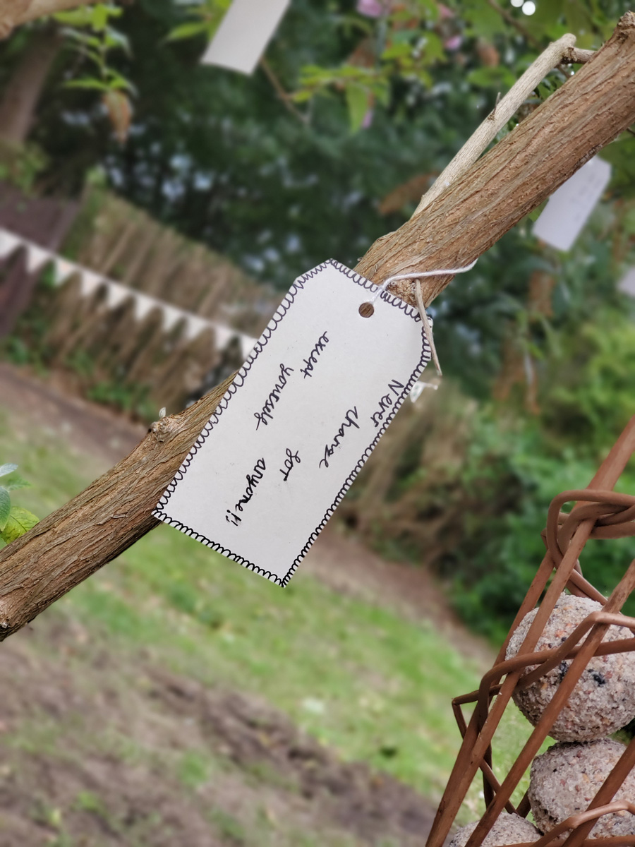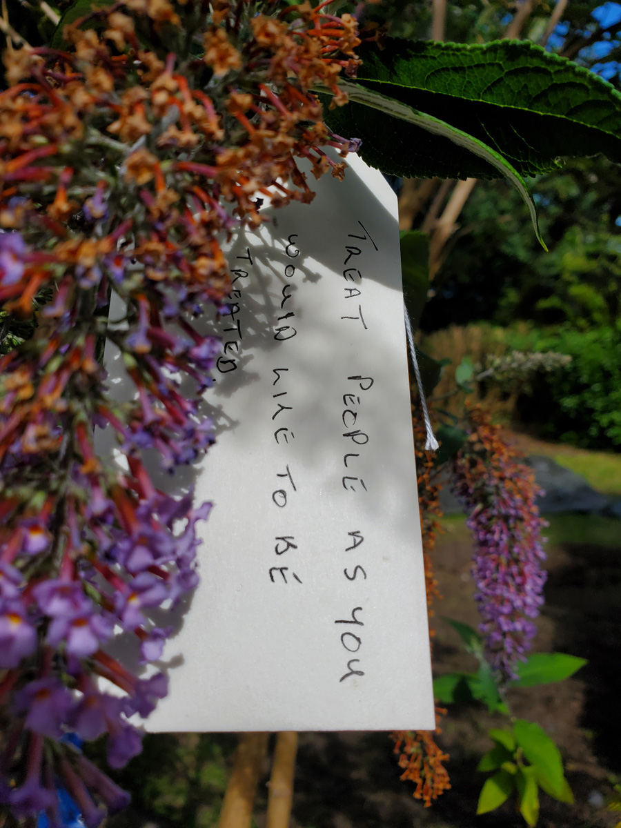 In conversation about the Hub, Kevin had given us a couple of choice quotes from his father that had helped him create an ethos for life, so we decided to ask visitors for the best advice they had been given, to ask them to write this on a paper tag and attach to the beautiful buddleia tree in the garden. As more and more tags were added, the tree became great installation for people to explore.