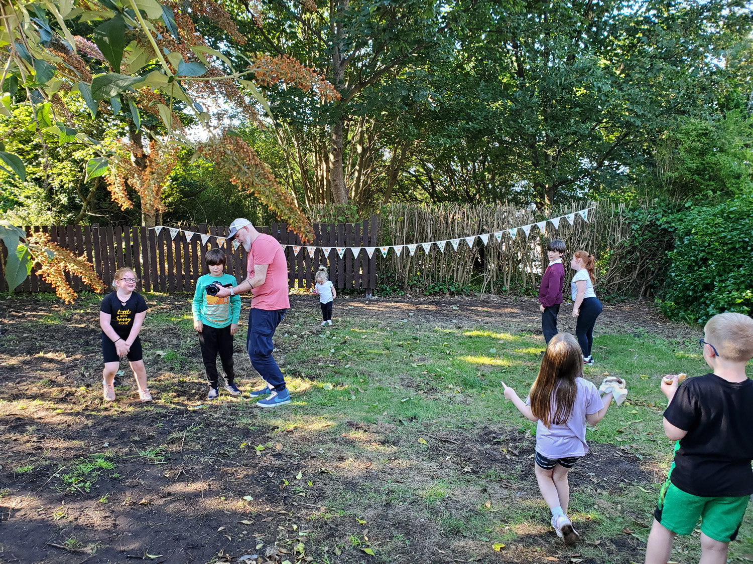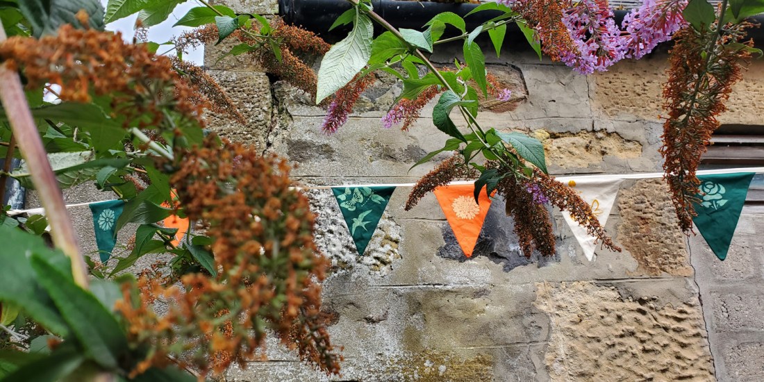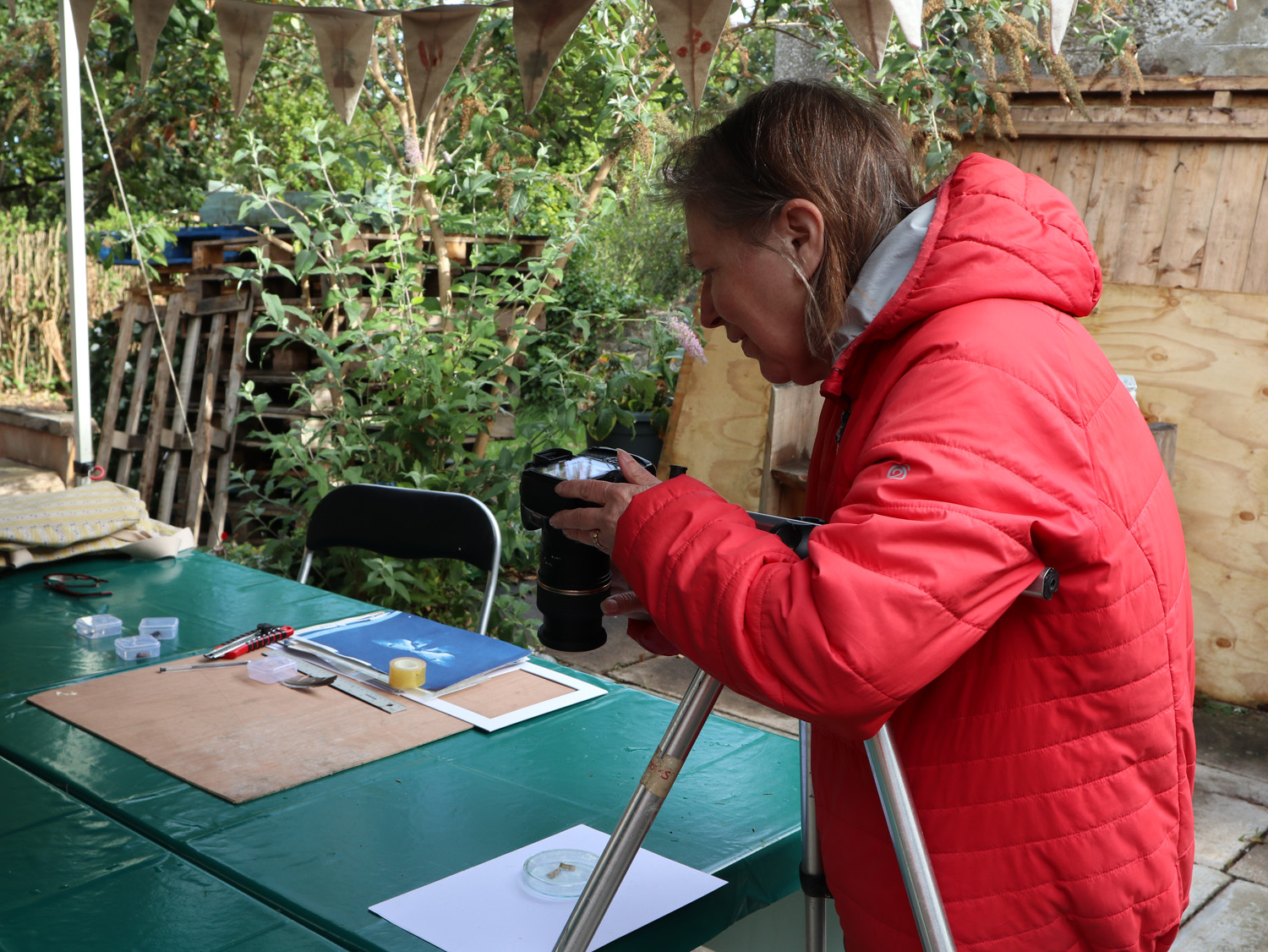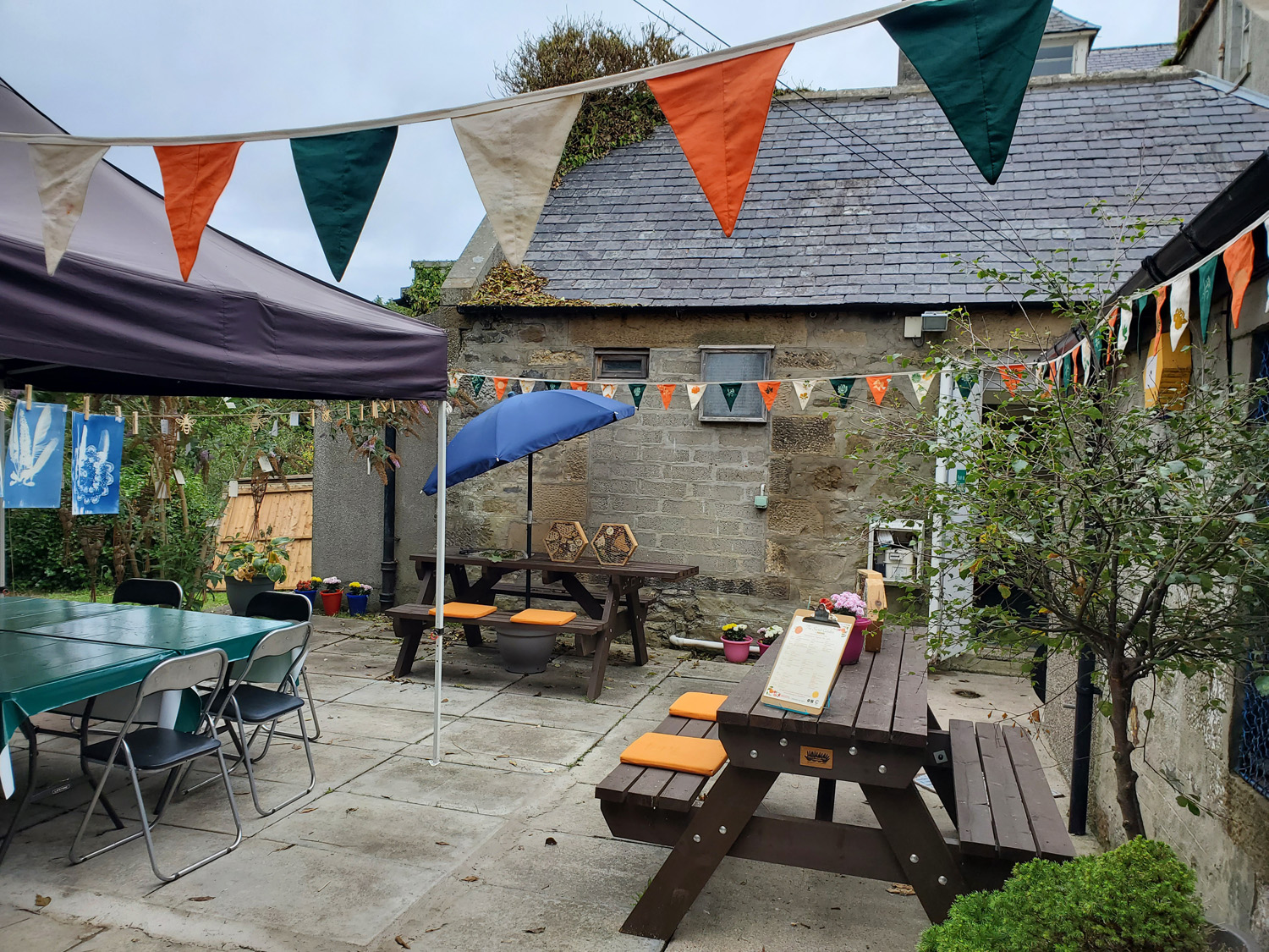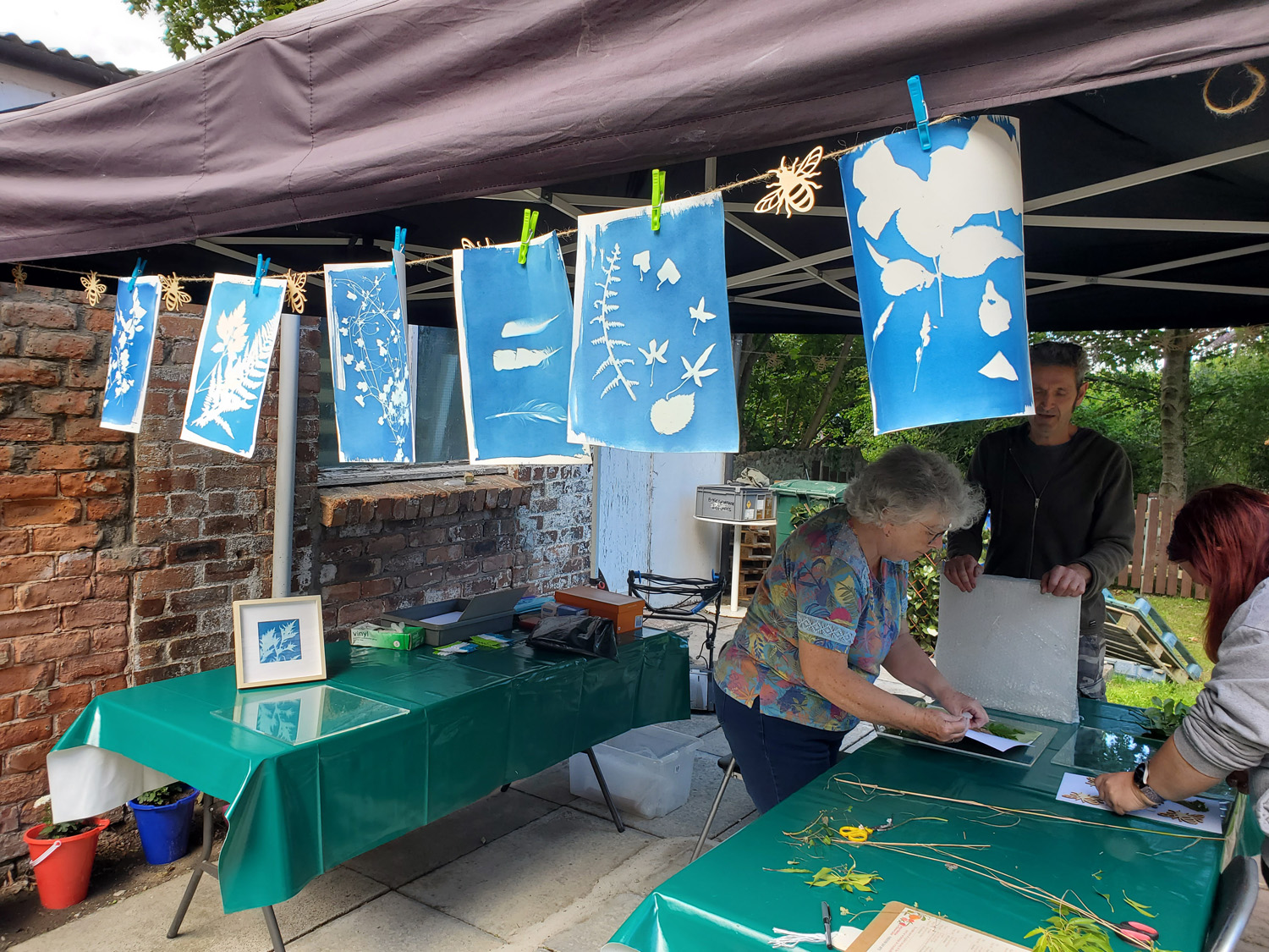 Our accessible activities included cyanotype printing using plants from the garden, making bee hotels, turning smartphones into microscopes using laser pointers, making willow bird feeders and creating simple things that would enhance the space such as nature inspired decorative bunting. All the activities took place in the garden, which at the same time was being cleared by volunteers, and conversations about what was proposed in the space happened at the same time as our activities. The process was organic and developed day by day but in this way, the garden became a colourful space to sit, try out new things, relax and socialise. We gradually became part of the Hub ‘family’ and the garden became a multigenerational gathering place where we were able to introduce new people to both the garden and the hub in a creative conversational environment and introduce new ideas to the space such as a community BBQ.