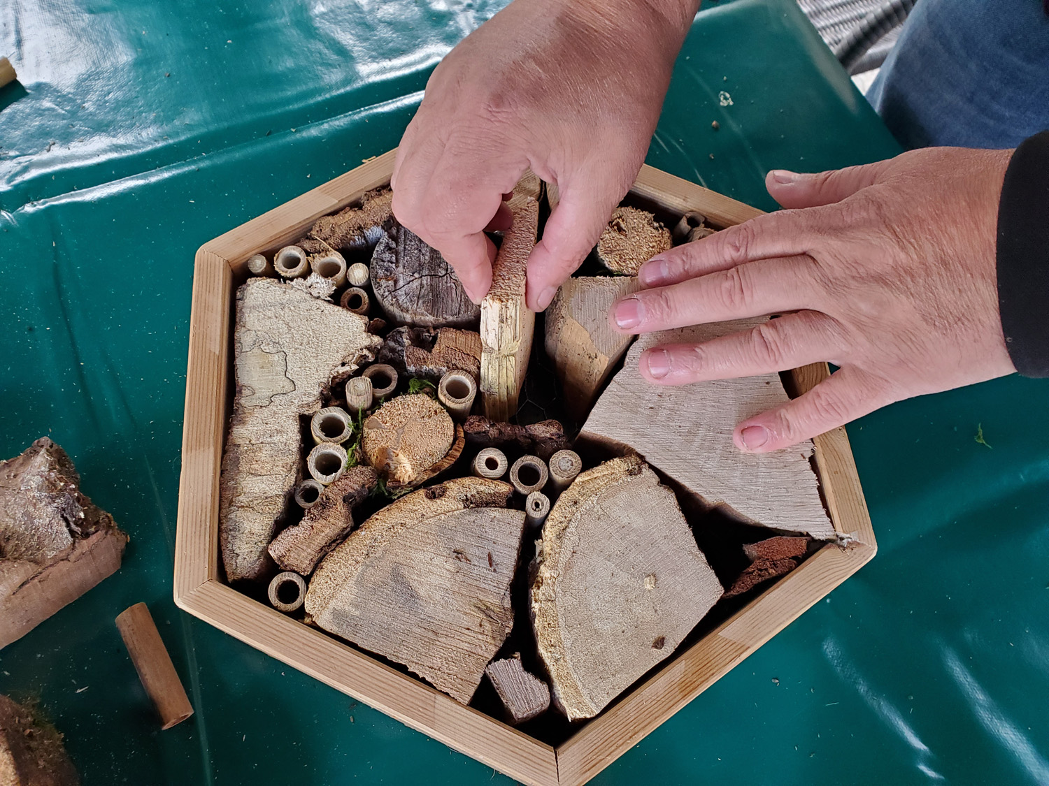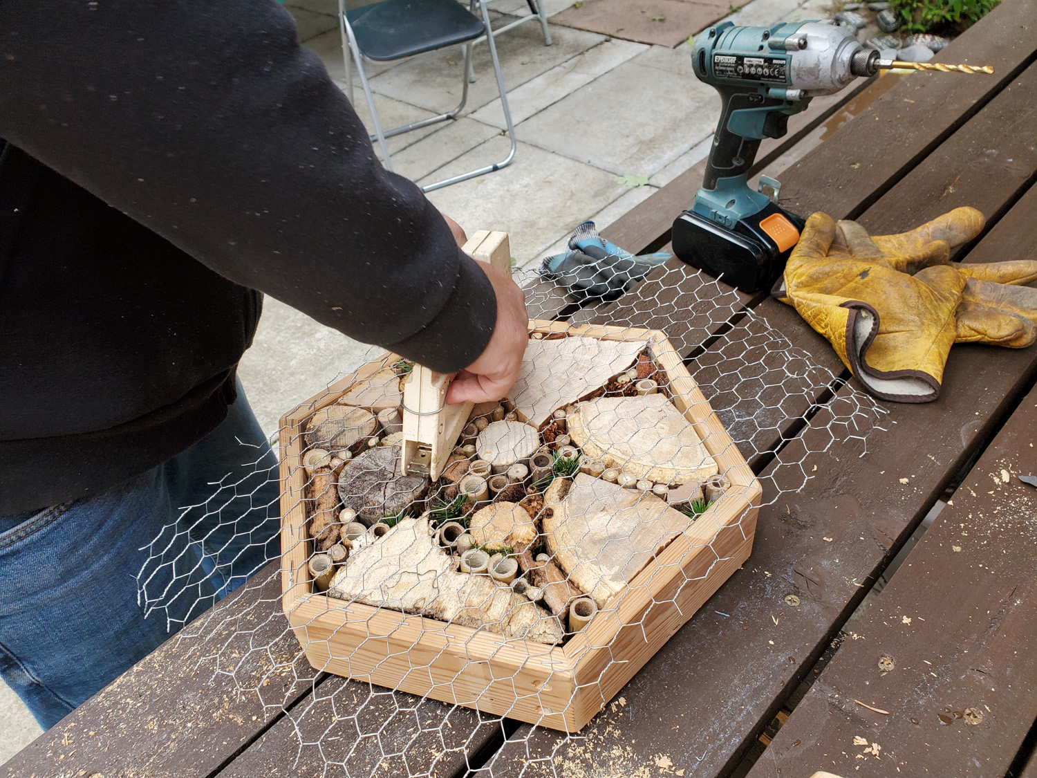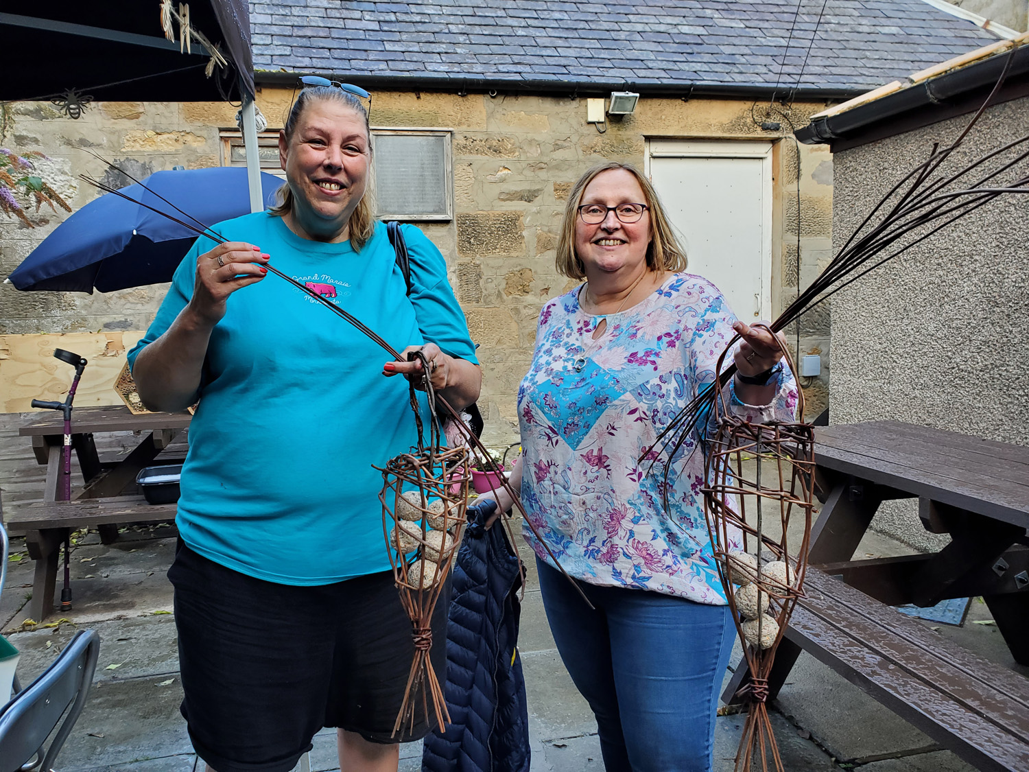 “A key aspect of the residency was focussing on using our natural environment for inspiration, and natural materials for the practical activities. The resultant bee hotels, willow bird feeders and cyanotype prints were all much admired. The relaxed pace of the activities, and outdoor location, gave participants time to recharge their batteries and relax from the stresses of everyday life. The Hub volunteers and customers who participated directly or as support crew covered a wide age range, and came from a variety of backgrounds, including ex-offenders, some battling with drug or alcohol issues, others dealing with mental health or physical health difficulties“