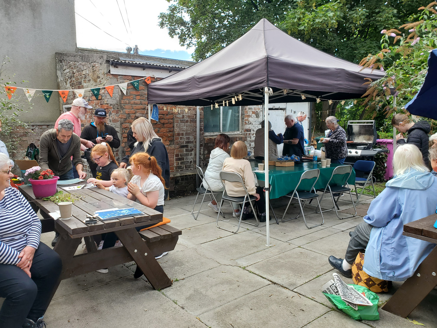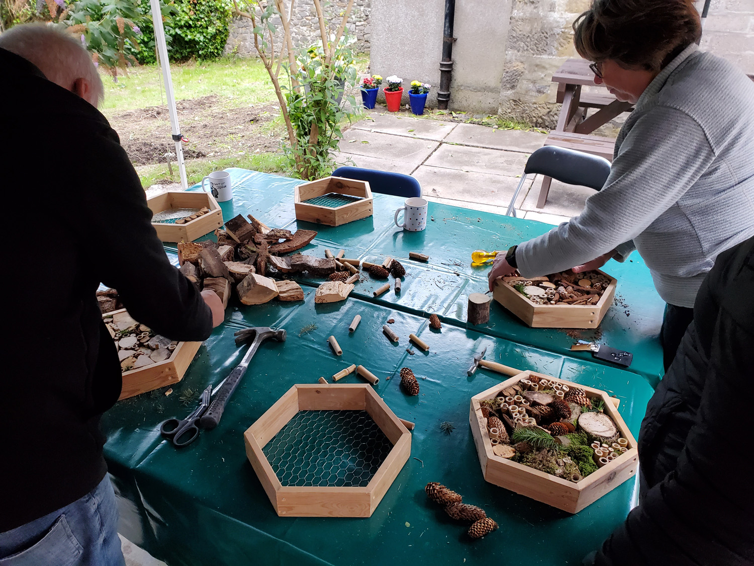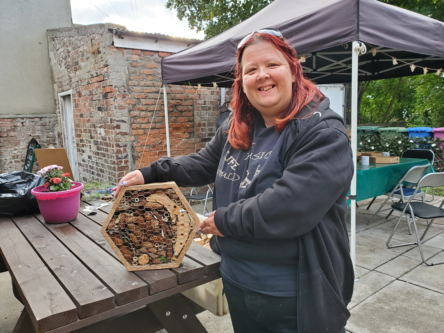 We called the project ‘The Secret Garden’ as the main access was down a side alley that most people had never noticed. The garden and courtyard were cleaned and cleared by the volunteers and people donated flowers in pots, so we were able to make the space colourful and inviting. We added a gazebo, tables and chairs, nature books, microscopes and programmed a range of creative workshops and nature inspired activities which were open to all; volunteers, visitors to the Hub and other groups that we had met along the way. The volunteers who were developing the garden had clear ideas about the space so we offered ideas where appropriate, but saw our role primarily as activating the garden as a social space and engaging people with nature and wellbeing.