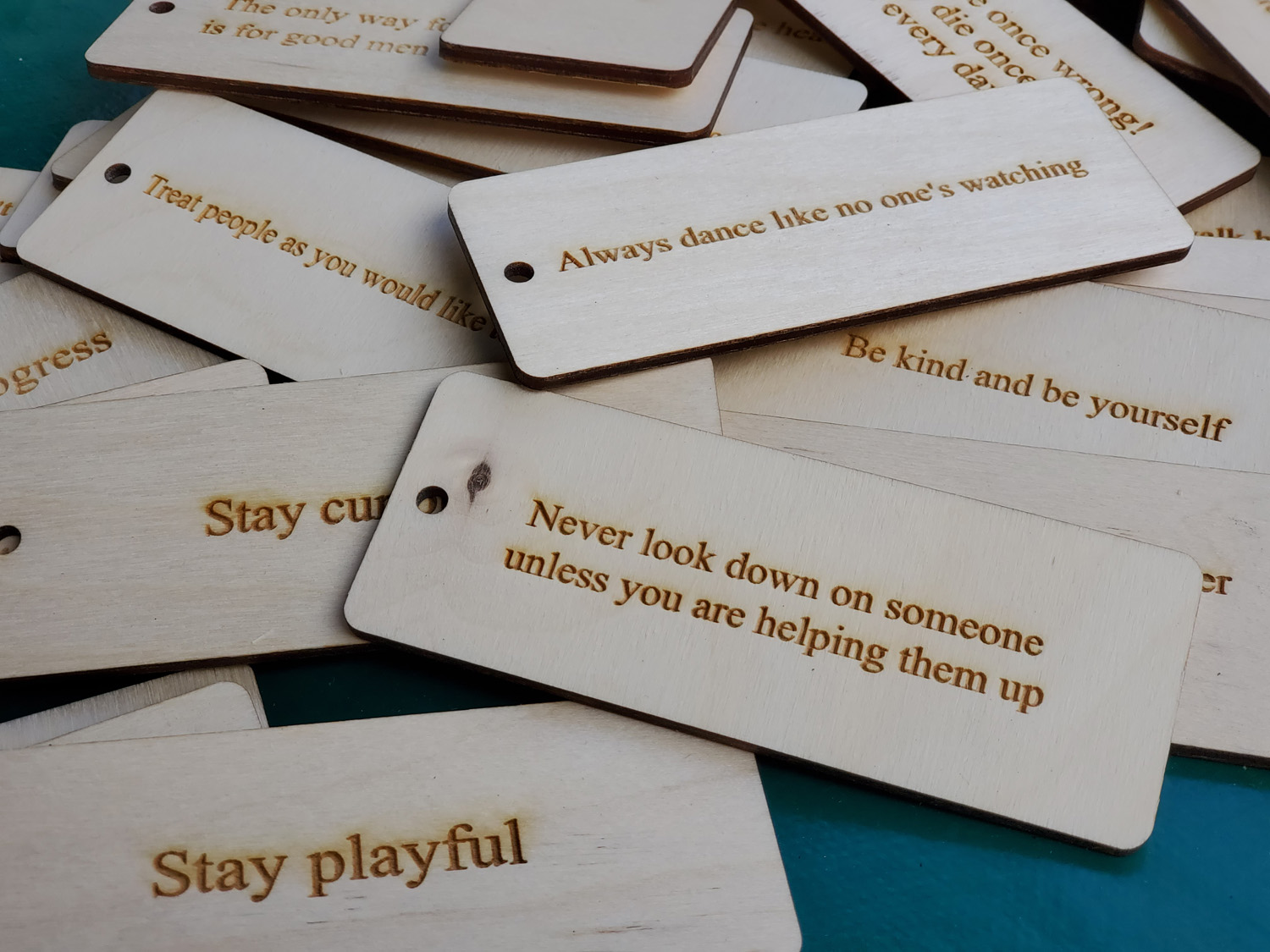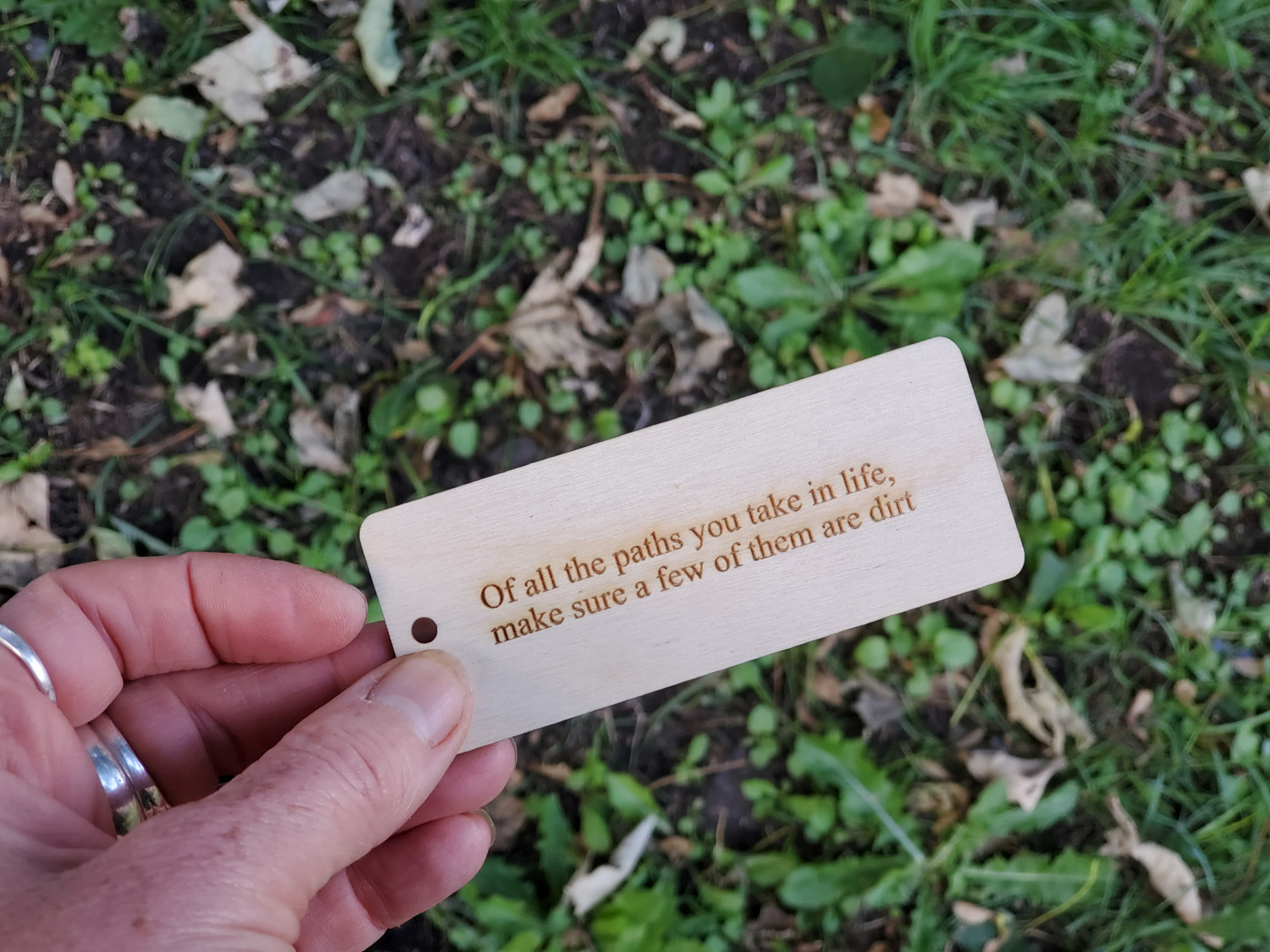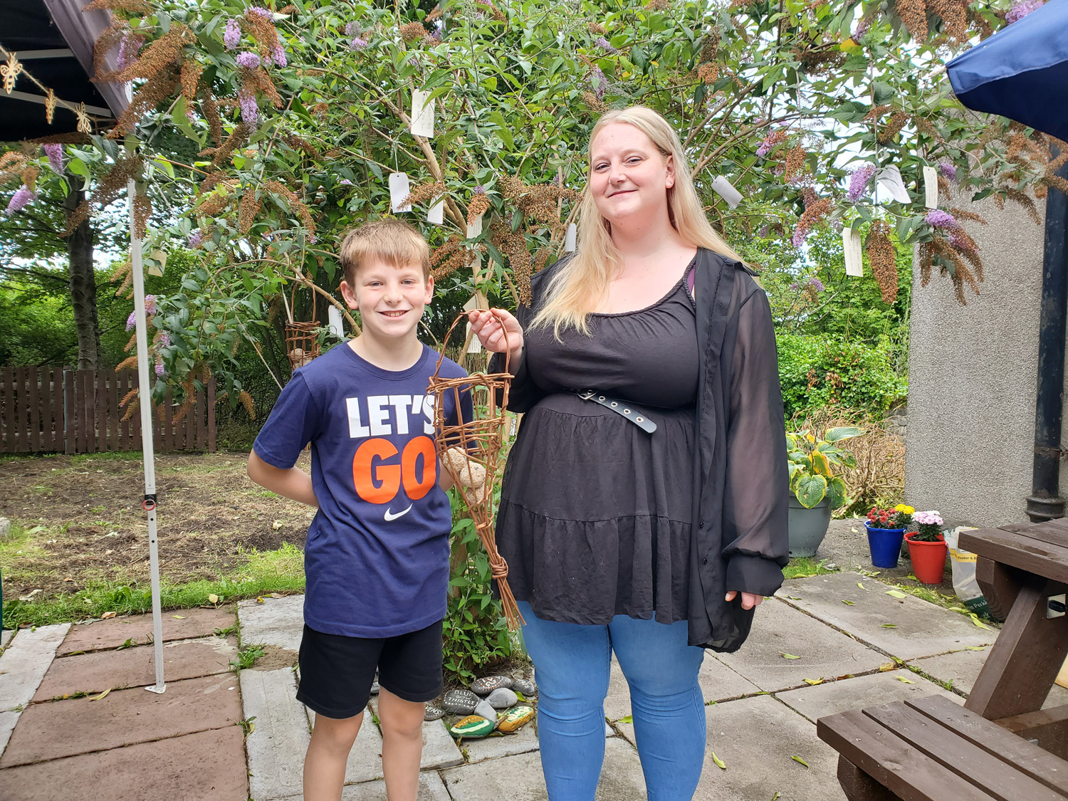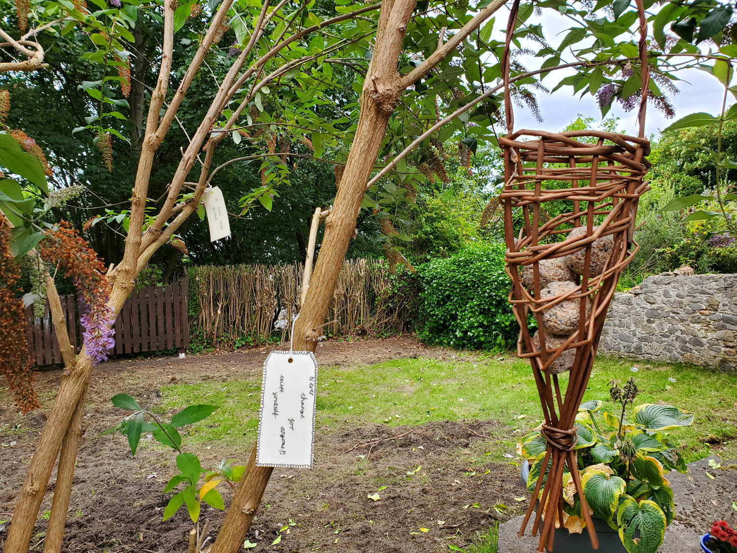 We wanted to leave something more permanent for the garden so we had all the words of advice collected at our first visit laser printed onto wooden tags by local engraver Steve (who secretly added an additional tag with his own advice) These were left with the Hub to be incorporated in the garden together with plant identifier painted stones, willow bird feeders and the nature inspired bunting.