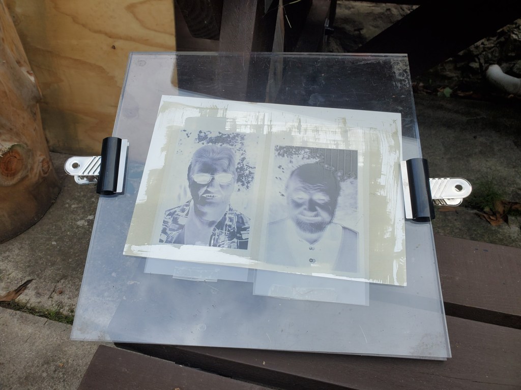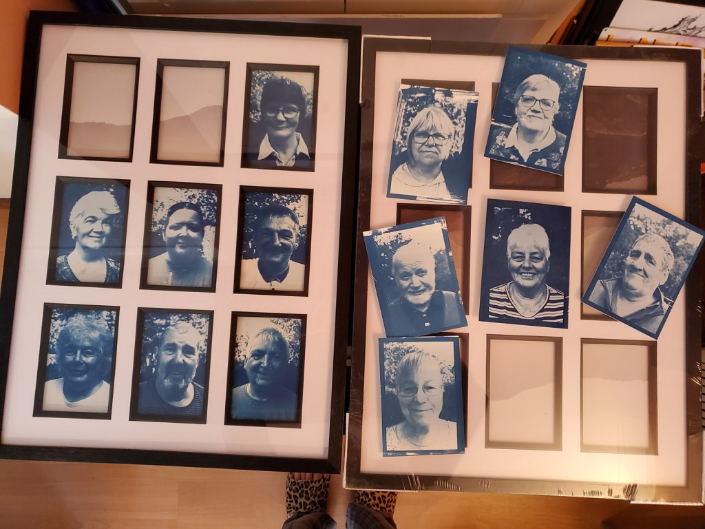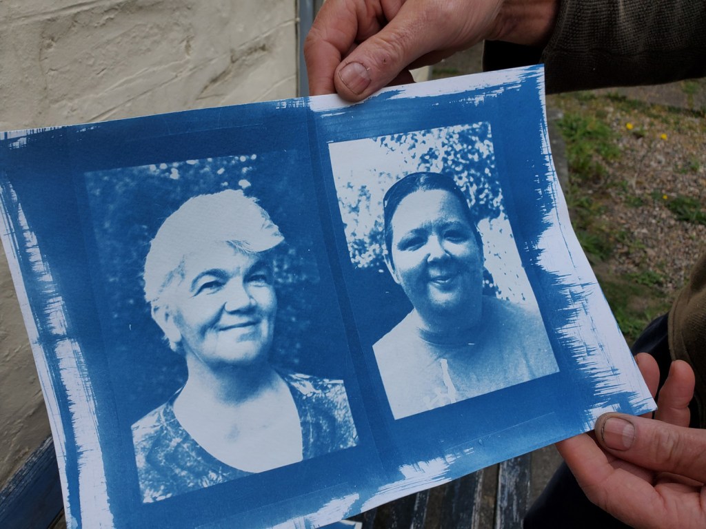 One of the continuing conversations we were having between us while we were at the Hub, was what else we would do that went beyond our workshops and what would that be? Over our residency period at The Hub we were really impressed with how the volunteers worked together and the wide variety of life experiences they have and use in their contacts with visitors to the Hub. Whatever problem someone walks in with, someone among the volunteers had experience and wisdom from their own lived experience to support them. We realised that we wanted to mark this in some way so we set up a garden photographic studio and began to take portraits of the volunteers. We then treated these images in the same way as we had the moths; turned them into negatives and then printed them using the Cyanotype process. The result was a series of powerful portraits which we framed and gave to the Hub as a way of thanking them for working with us so generously and was a way for us to extend the sense of respect we had for them and the work they do.