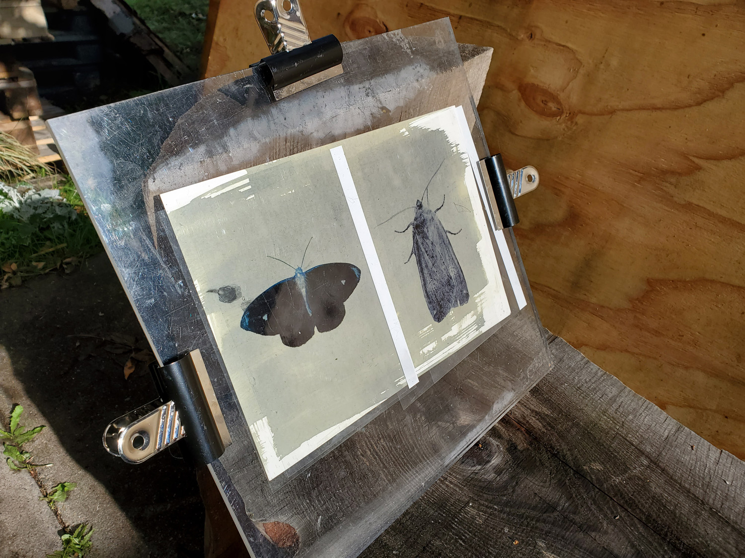 Cyanotypes using plants from the garden and moths that visited the garden: