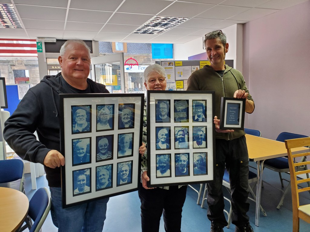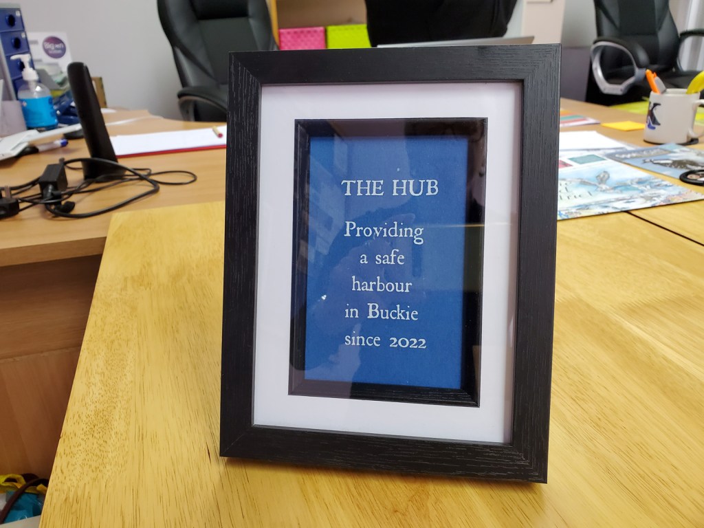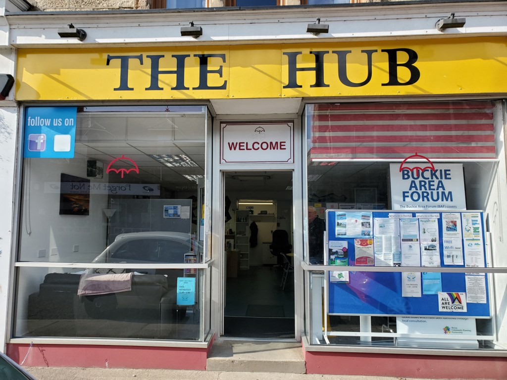We came across The Hub, a community space that was being set up on the main street and that had only just opened its doors. We met Gordon McDonald, Chair of Buckie Area Forum, who explained that the cost-of-living crisis was really impacting the folk of Buckie and that when the opportunity of using an empty shop on the main street has presented itself, a group of volunteers had stepped in and helped convert the space to a ‘hub’. Here, people could access information, be signposted to services and could get a cuppa, friendly advice and use the internet.
