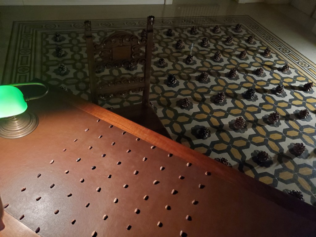 Arranged formally on the floor were 72 pine cones and mirroring this pattern on the table were 72 seeds, one seed from each cone. Seated at the table was ‘The Establishment’.