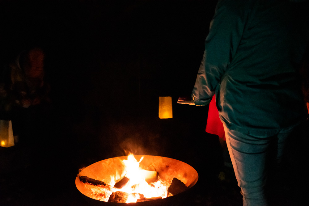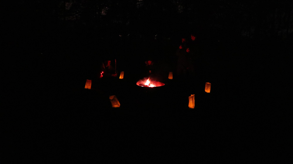The event began with a magical walk ritual along the river to an installation and gathering full of fire and light among the magisterial yew groves. The immersive installation and soundscape featured ideas and images created by participants together with the artists as they explored the paths by the River Tweed together over the Summer months.