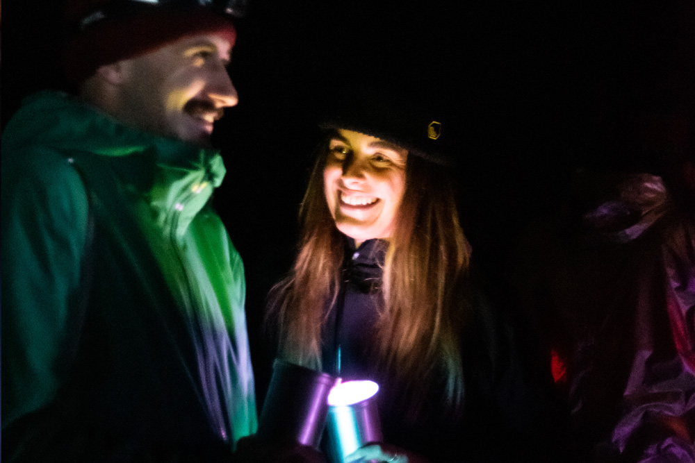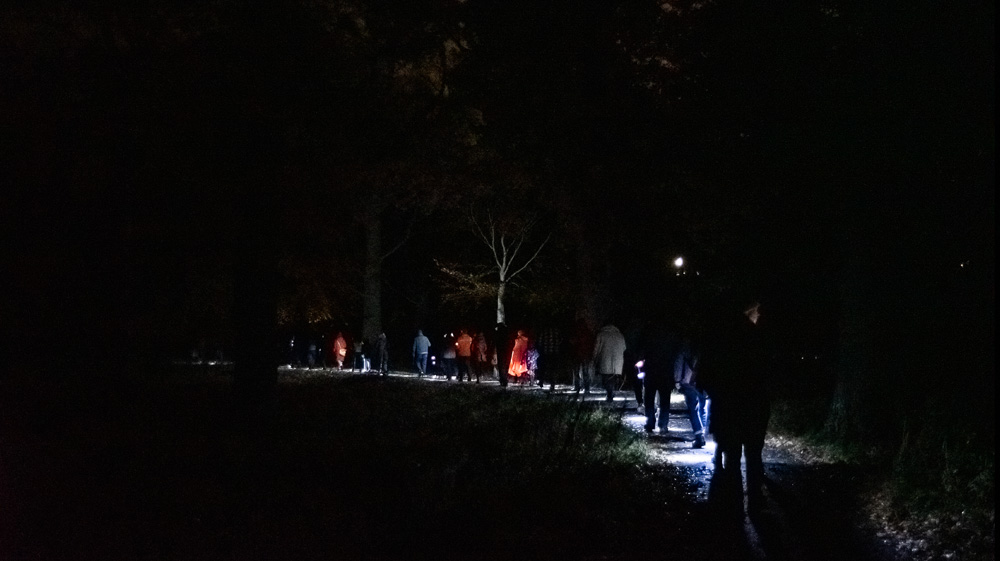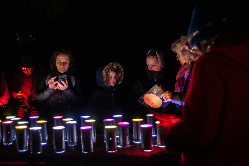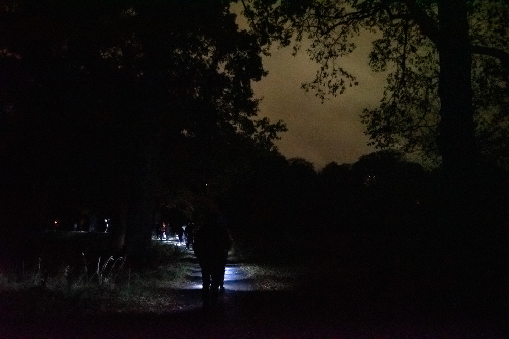 “A slow night-time procession marks the turning of the seasons – a gentle, barely perceptible shift from a time of abundant activity towards a time of rest. We wind our way through the woods in darkness, becoming attuned to the flitting of bats, the call-and-response of the tawny owls, and the tread of our footsteps gradually shifting with the terrain. We form a line, evenly spaced, walking in loose slow rhythm, each carrying a lantern illuminated by an image of a riverside flower in bloom. We are immersed together in our own thoughts and visions. Each sudden splash off to our right is a reminder of the perpetual presence of the river“