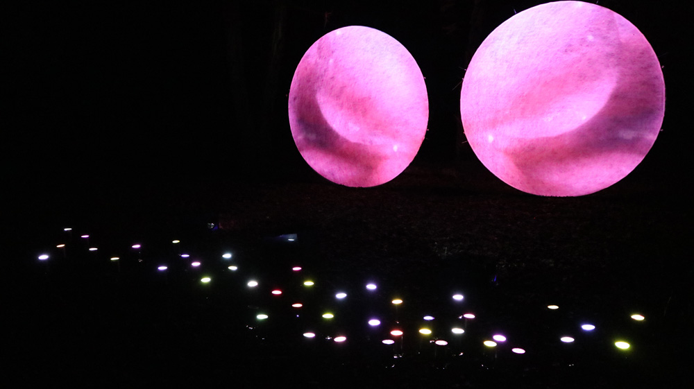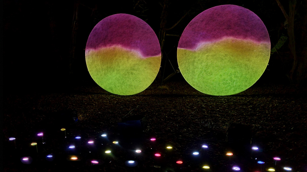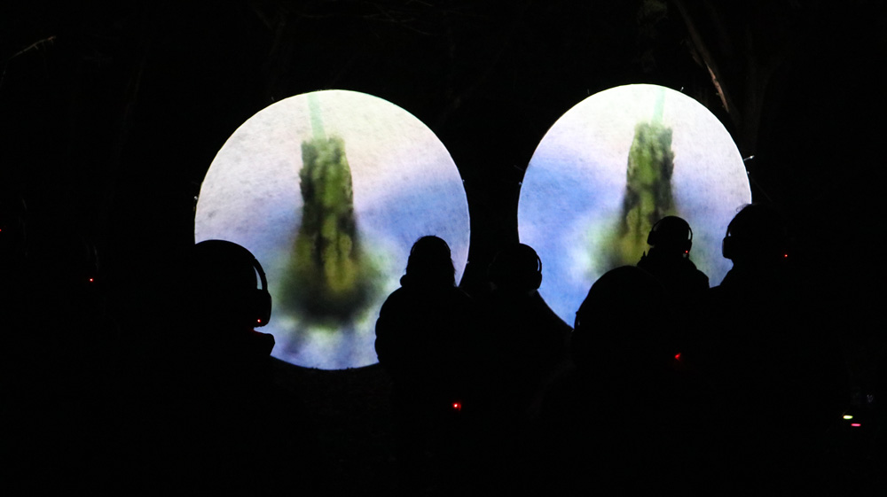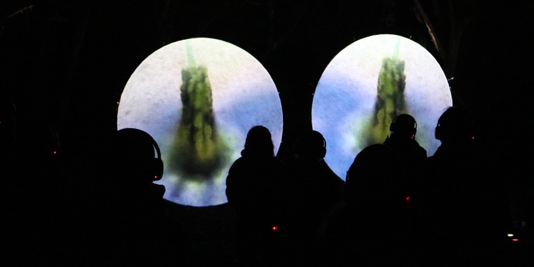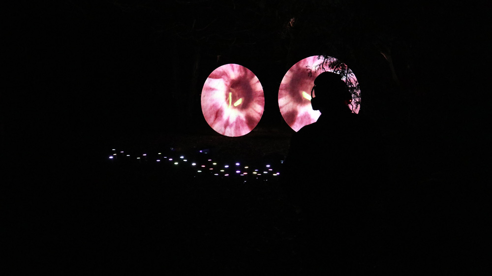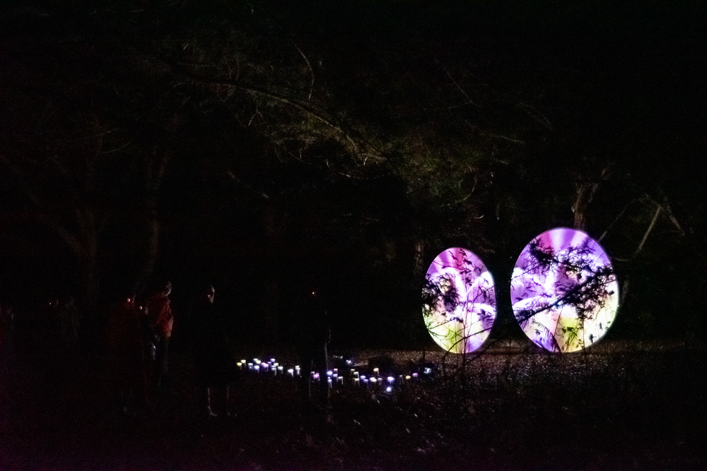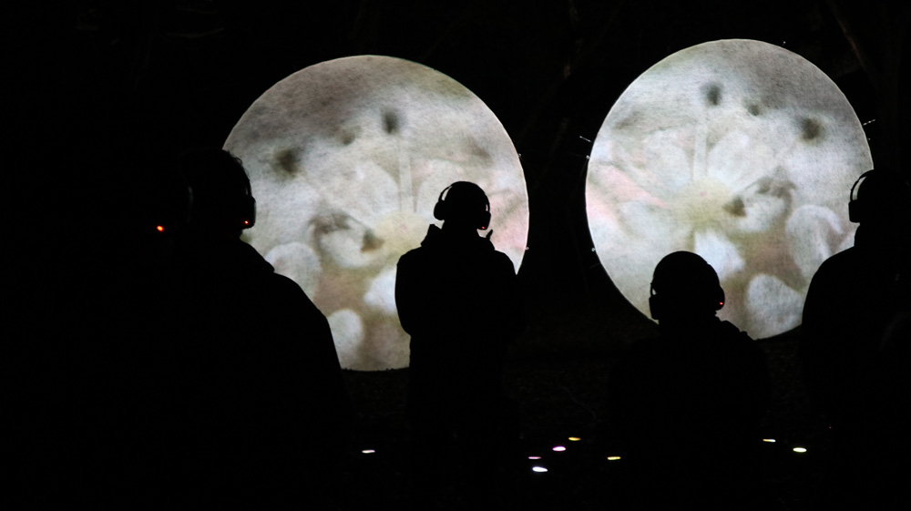 “A gentle ascent, a bend in the path, gradually and suddenly we come to two huge discs of light, like portals or planets in the darkness of a forest clearing. Vivid microscopic images of flowers phase in and out across these discs, redolent of other worlds but in fact produced just a little further upstream. An ambient soundscape and voiceover cross the seasons, from the promise of a summer morning to autumnal evenings and the floating dreams of all that the river might carry (away)” Tom Jeffreys. River Messenger. Connecting Threads.