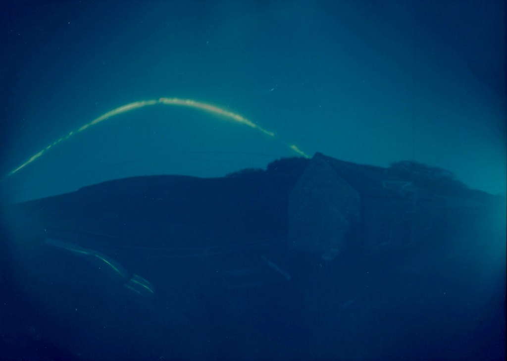 We’ve become interested in a photographic process called solargraphy. Small pinhole cameras are attached to a fixed point and capture the place where they are situated over a period of time, usually weeks or months. The cameras are positioned to point south and the resulting evocative images show the path of the Sun. We have made our first experiment and the below image is the result .. the path of the sun captured over 2 days.